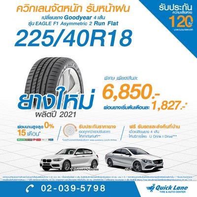 - ยางกู๊ดเยียร์ รุ่น EAGLE F1 Asymmetric2 Run Flat ขนาด 225/40R18 นำเข้าจากเยอรมัน ราคาพิเศษเพียงเส้นละ 6,850 บาท พร้อมฟรีค่าแรง รับประกันความพึงพอใจ 14 วัน และรับประกันความเสียหายของยาง บาด บวม แตก ตำ 120 วัน พร้อมบริการช่วยเหลือรถเสียฉุกเฉินตลอด 24 ชั่วโมงเป็นเวลา 1 ปี