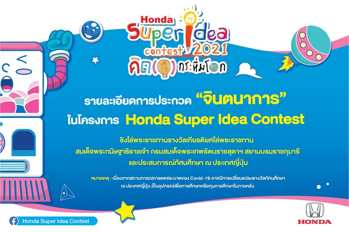 แม้สถานการณ์การระบาดของไวรัสโควิด-19 อาจจะทำให้เด็กไทยไม่สามารถออกไปทำกิจกรรมนอกบ้านได้เหมือนก่อน แต่ข้อจำกัดเหล่านี้ก็ไม่สามารถปิดกั้นความฝัน จินตนาการและความคิดสร้างสรรค์ที่อยู่ภายในเด็กทุกคนได้ ซึ่งการผลักดันความฝัน และการเสริมสร้างความคิดสร้างสรรค์เป็นสิ่งที่ฮอนด้าพร้อมที่จะสนับสนุนอย่างเต็มที่ บริษัท ฮอนด้า ออโตโมบิล (ประเทศไทย) จำกัด จึงเดินหน้าสานต่อ โครงการ “ฮอนด้า ซูเปอร์ ไอเดีย คอนเทสต์” เป็นปีที่ 17 ผ่านออนไลน์เต็มรูปแบบเป็นครั้งแรกโดยเชิญชวนเด็กไทย ระดับชั้นประถมศึกษาปีที่ 1 – 6 ทั่วประเทศ ที่มีอายุไม่เกิน 12 ปี ส่งผลงานไอเดียสิ่งประดิษฐ์สุดสร้างสรรค์ ที่มีความแปลกใหม่และเป็นประโยชน์ต่อสังคม ภายใต้แนวคิด “เปิดแคปซูลความฝัน ปลดปล่อยพลังแห่งจินตนาการ สานต่อไอเดียสุดสร้างสรรค์กับฮอนด้า” เพื่อชิงรางวัลโล่พระราชทานสมเด็จ