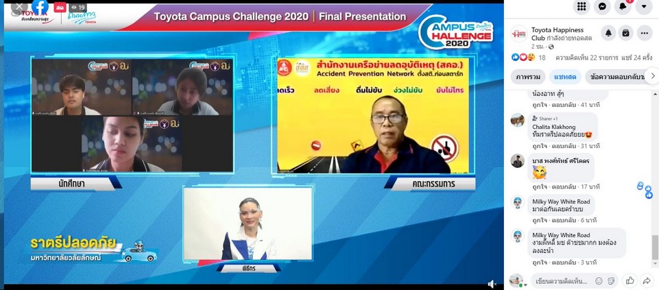 ประเทศไทย จำกัด ร่วมเป็นประธานในการประกาศผลรางวัลรอบชิงชนะเลิศกิจกรรม “Campus Challenge ครั้งที่ 7 ประจำปี 2020” ภายใต้โครงการโตโยต้าถนนสีขาว เพื่อเปิดโอกาสให้เยาวชนได้แสดงออกถึงความรู้ความสามารถและศักยภาพของตนเองอย่างสร้างสรรค์ รวมถึงการก่อให้เกิดการรับรู้และปรับเปลี่ยนพฤติกรรมการใช้รถใช้ถนนของคนรุ่นใหม่ ร่วมสร้างรอยยิ้มและลดการสูญเสียแก่สังคมไทย โดยได้จัดกิจกรรมผ่านช่องทางออนไลน์ (Zoom Meeting) เมื่อวันศุกร์ที่ 22 ตุลาคม ที่ผ่านมา