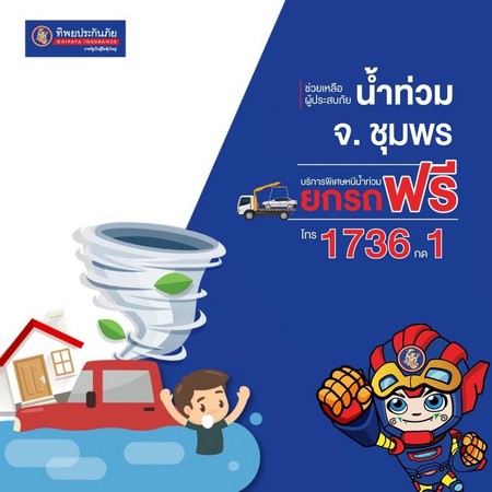 ดร.สมพร สืบถวิลกุล ประธานเจ้าหน้าที่บริหาร บมจ. ทิพย กรุ๊ป โฮลดิ้งส์ และ กรรมการผู้จัดการใหญ่ บมจ.ทิพยประกันภัย ส่งทีม TIP Smart Assist พร้อมหน่วยหนุมานทิพยจิตอาสา ลงพื้นที่ให้ความช่วยเหลือ พี่น้องประชาชนจังหวัดชุมพร ที่ได้รับผลกระทบจากฝนตกหนัก ทำให้น้ำท่วมฉับพลันและน้ำไหลหลาก สร้างความเสียหายและความเดือดร้อนอยู่ในขณะนี้ เพื่อบรรเทาความเดือดร้อนในเบื้องต้น สำหรับผู้ประสบภัยทุกท่านที่ต้องการความช่วยเหลือเคลื่อนย้ายรถออกจากพื้นที่น้ำท่วม ทิพยประกันภัยได้จัดเตรียมรถยกเพื่อช่วยเหลือฟรีไม่ว่าจะเป็นลูกค้าของบริษัทฯหรือไม่ก็ตาม และสำหรับลูกค้าของทิพยประกันภัย สามารถโทร.ขอความช่วยเหลือ หรือแจ้งเคลมที่ Hotline 1736 กด 1 ตลอด 24 ชั่วโมง หรือติดต่อสำนักงานสาขาในพื้นที่นอกจากนี้ ยังได้ร่วมกับสถานีบริการน้ำมัน ปตท. ที่เข้าร่วมโครงการ TIP@pttstation บจก.เค.พี.เอส.กรุ๊ป (สถานีบริการน้ำมัน เดอะไทเกอร์) อ.หลังสวน จ.ชุมพร ให้ผู้ประสบภัยน้ำท่วมสามารถนำรถมาจอดได้ฟรีอีกด้วย