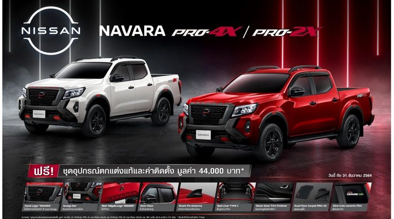 นิสสัน ประเทศไทย จัดโปรโมชั่นพิเศษส่งท้ายปีสำหรับนิสสัน นาวารา ใหม่ รถกระบะกล้าเพื่อคนแกร่ง เสนอแคมเปญพิเศษ ออกรถ นาวารา PRO-4X สีแดงเบิร์นนิ่ง เรด และ PRO-2X สีแดง เบิร์นนิ่ง เรด, สีดำ แบล็ค สตาร์, และสีขาว ไวท์ เพิร์ล รับฟรี !! อุปกรณ์ตกแต่งแท้จากนิสสันพร้อมค่าติดตั้ง มูลค่า 44,000 บาท จำนวน 9 รายการ เสริมความดุดัน ยกระดับความหล่อที่เหนือใคร ประกอบด้วย (1) โลโก้ NAVARA ฝากระโปรงหน้าสีส้มลาวา (2) โลโก้ท้าย (3) กันชนหน้าแบบออฟโรด (4) คิ้วกันสาดประตู (5) เสาอากาศแบบครีบฉลาม (6) พื้นปูกระบะท้าย (7) ชุดแต่งขอบประตู (8) ชุดพรมและผ้ายางปูพื้น และ (9) ฟิล์มเซรามิก