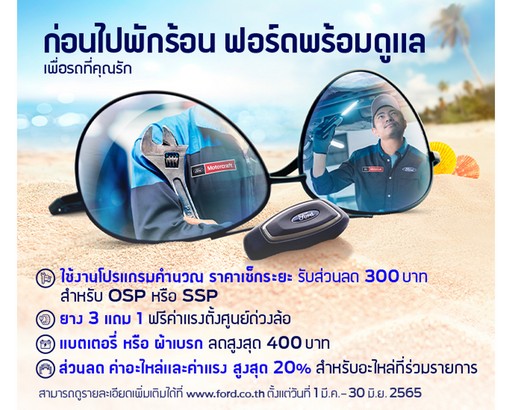 ฟอร์ด ประเทศไทย เดินหน้ามอบความมั่นใจในการใช้รถให้กับลูกค้าตลอดช่วงเทศกาลวันหยุด ล่าสุดเปิดตัวแคมเปญ ‘ก่อนไปพักร้อน ฟอร์ดขอดูแล’ คัดสรรข้อเสนอด้านบริการแบบครบครัน อาทิ ส่วนลดพิเศษชุดน้ำมันเครื่องสุดคุ้ม (Oil Save Pack) ส่วนลดโปรแกรมบำรุงรักษาตามระยะเมื่อแสดงเอกสารจากโปรแกรมประเมินค่าใช้จ่ายในการเข้ารับบริการ (Service Price Calculator) มูลค่า 300 บาท ส่วนลดค่าอะไหล่สูงสุดถึง 20% ข้อเสนอพิเศษ ซื้อยางรถยนต์ 3 เส้น แถมฟรี 1 เส้น และส่วนลดพิเศษสำหรับการเปลี่ยนผ้าเบรก หรือแบตเตอรี่ บริการตรวจเช็คสภาพรถทั่วไปฟรี 30 รายการ รวมถึงบริการรับและส่งมอบรถนอกสถานที่และหน่วยบริการเคลื่อนที่ Mobile Service เพียงนำรถเข้ารับบริการที่ศูนย์บริการฟอร์ดทั่วประเทศตั้งแต่วันที่ 1 มีนาคม – 30 มิถุนายน 2565