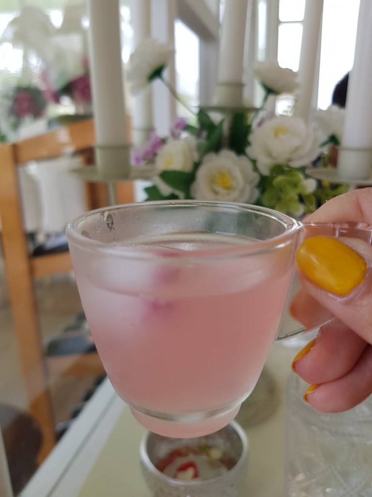 ก่อนจะเริ่มเมนูแรก ทางร้านได้เตรียม Welcome Drink ไว้ต้อนรับ อากาศแบบนี้ต้องดับร้อนด้วยน้ำใบเตย ที่มีความหวานหอมเย็นชื่นใจ โรยด้วยดอกมะลิและใบกุหลาบ ใส่ในขันใบเล็ก ๆ ให้อารมณ์ความย้อนยุคขึ้นมาเลย