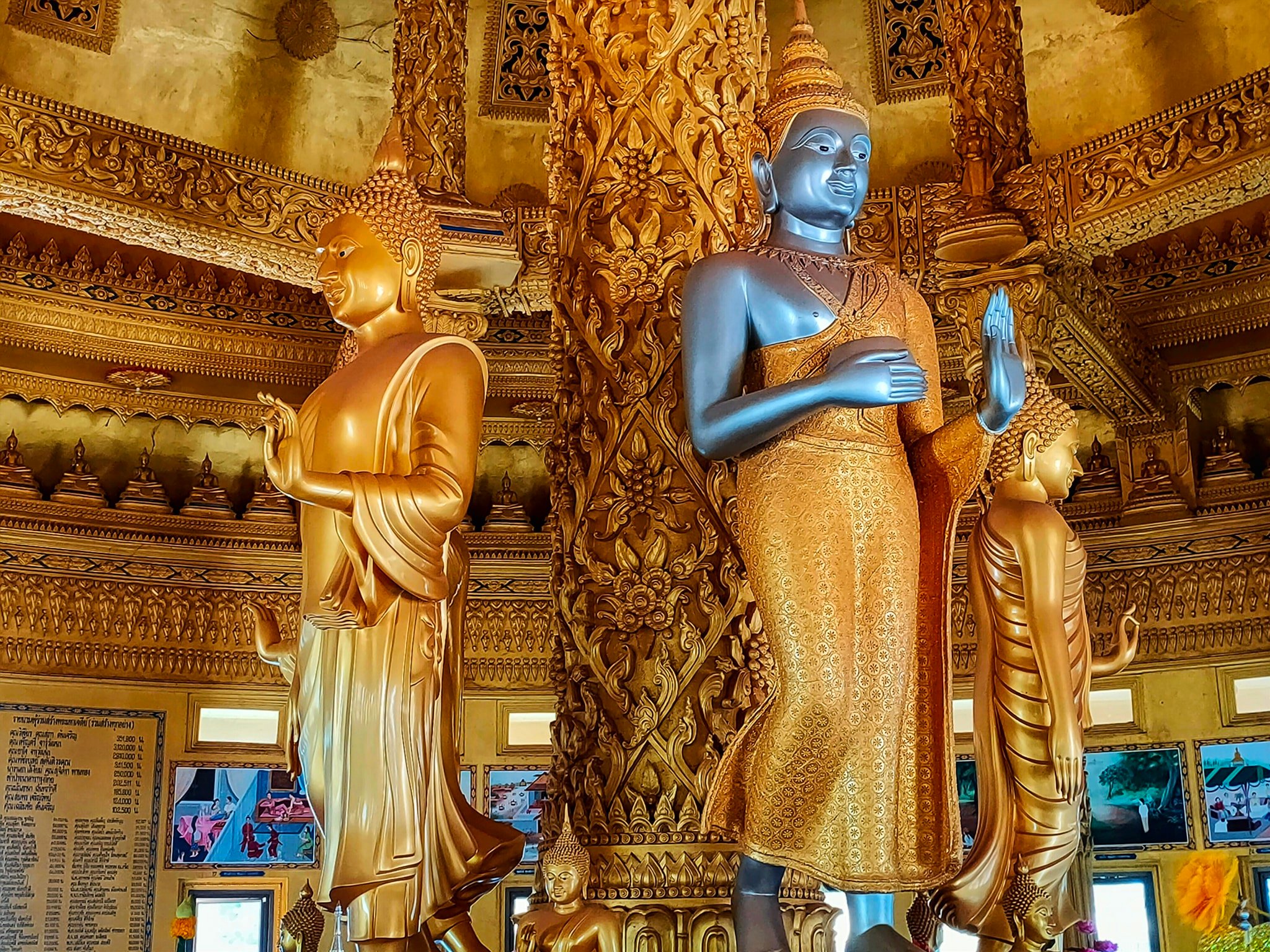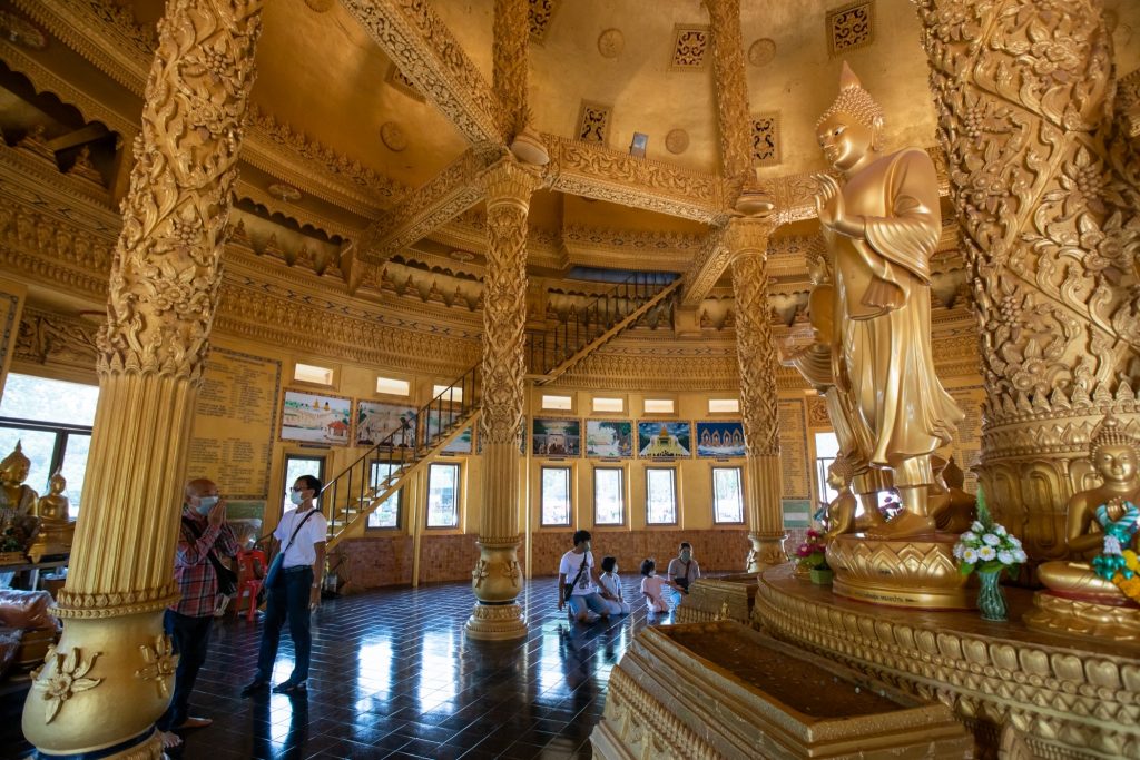ไหว้พระขอพรตามความปรารถนากันแล้ว เราก็เดินเข้าไปกราบไหว้ขอพรพระเพื่อความเป็นสิริมงคลภายในองค์พระมหาธาตุเจดีย์ ด้านหน้ามีซุ้มประตูทางเข้า 4 ทิศ แต่ละประตูมีบันไดพญานาคนำเข้าสู่ตัวเจดีย์ ภายในมีพระพุทธรูปปางยืนเป็นแกนกลาง 5 องค์ ลงสีทองเหลืองอร่าม ประดิษฐานอยู่ตรงการ ล้อมรอบด้วยเสาปูนปั้นที่แกะสลักเอาไว้อย่างวิจิตรบรรจง และยังมีบันไดให้เดินขึ้นไปยังชั้นบนได้ด้วย