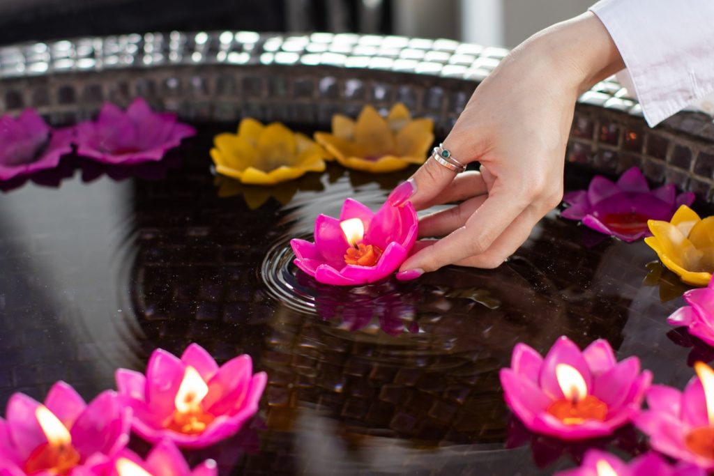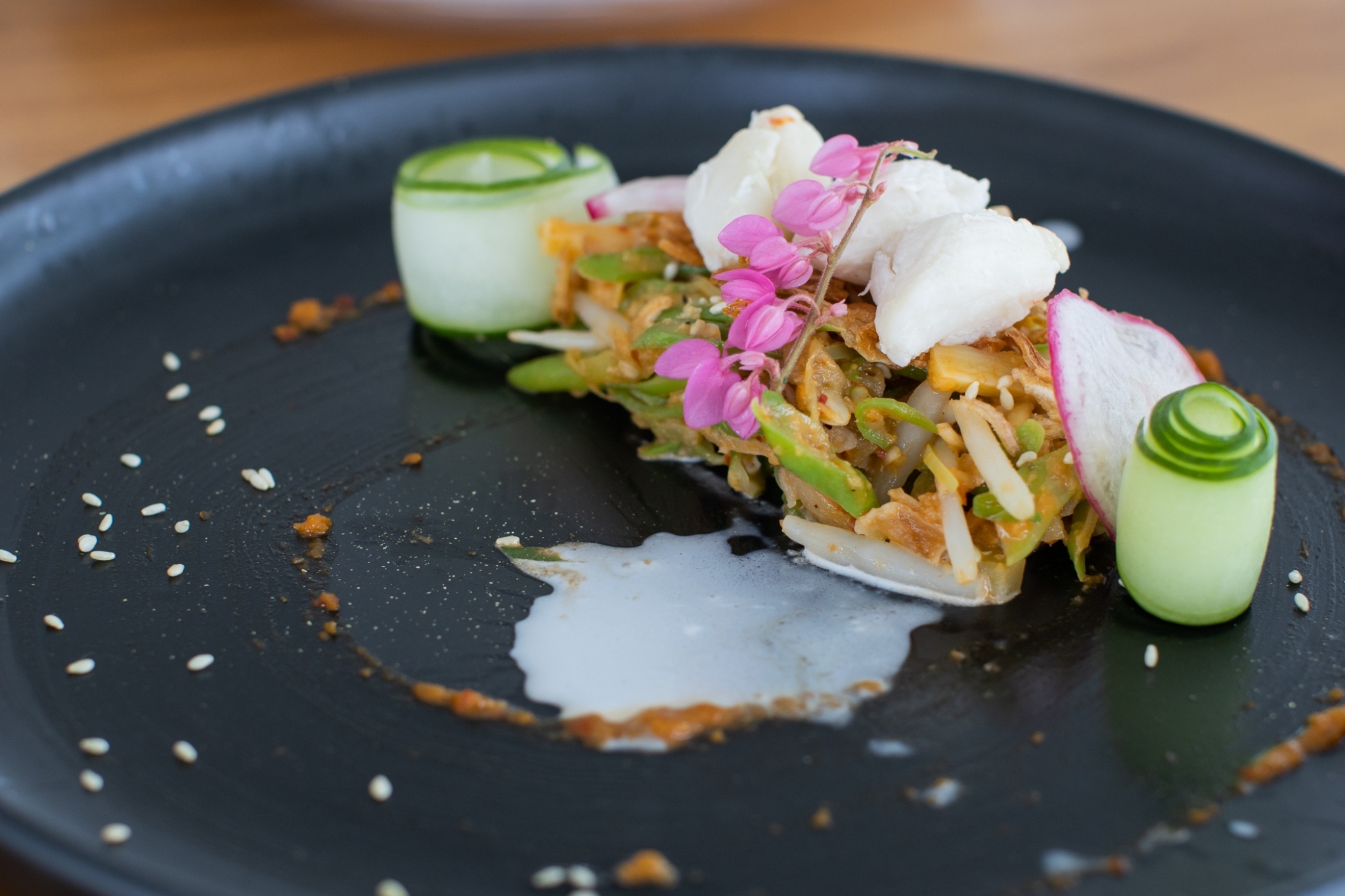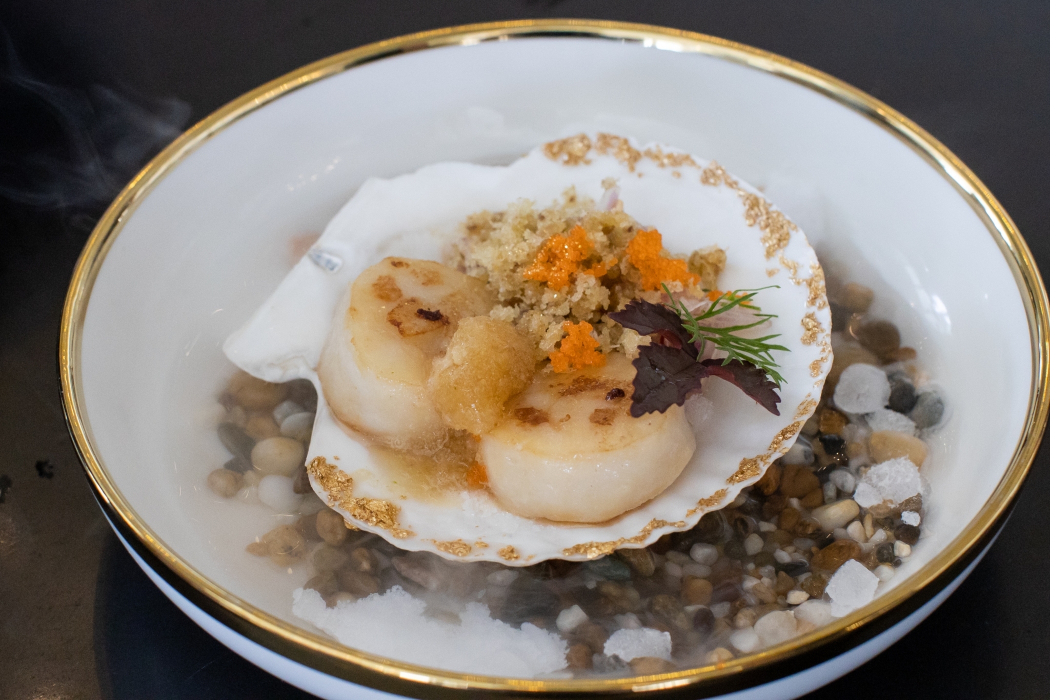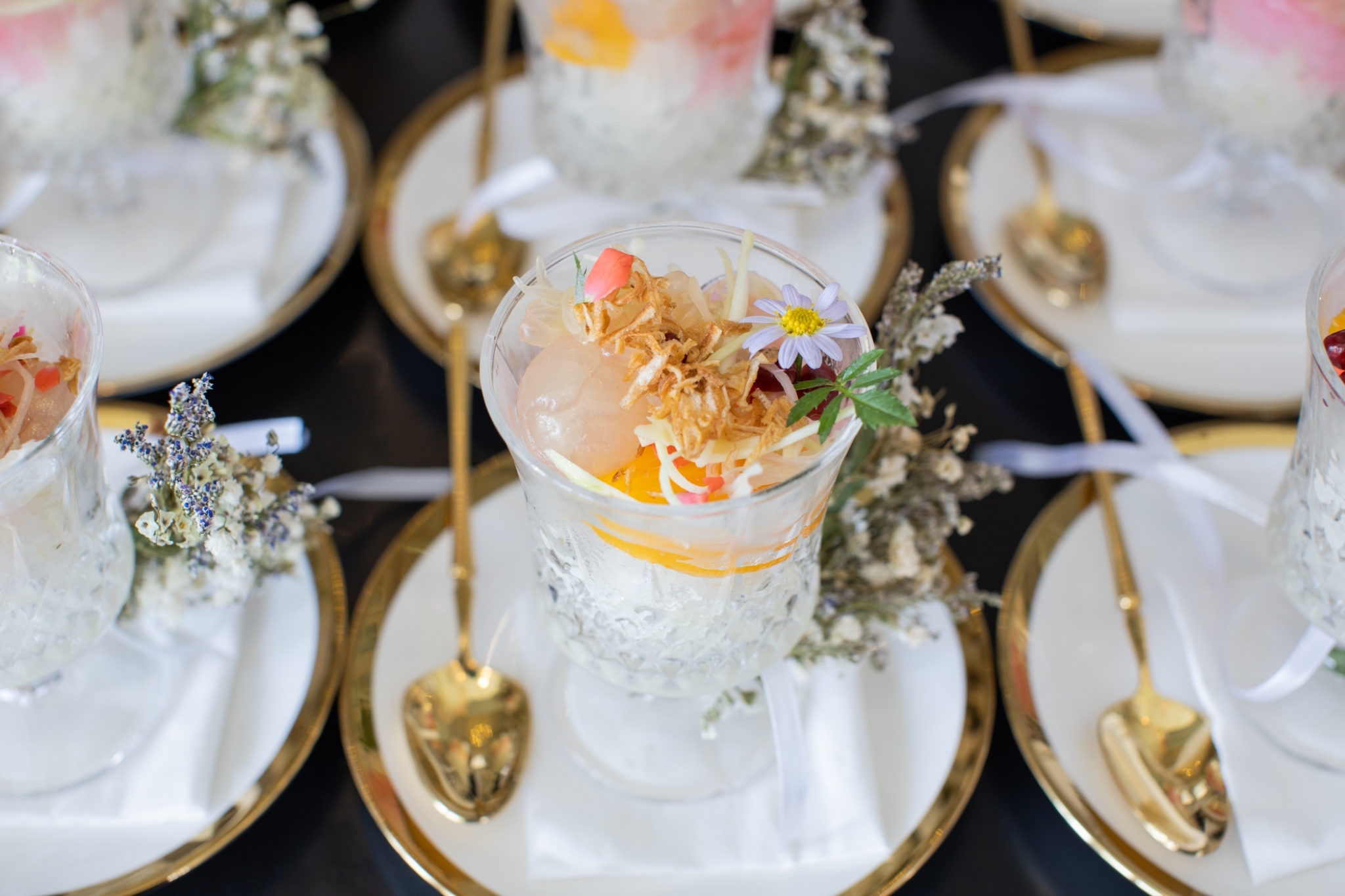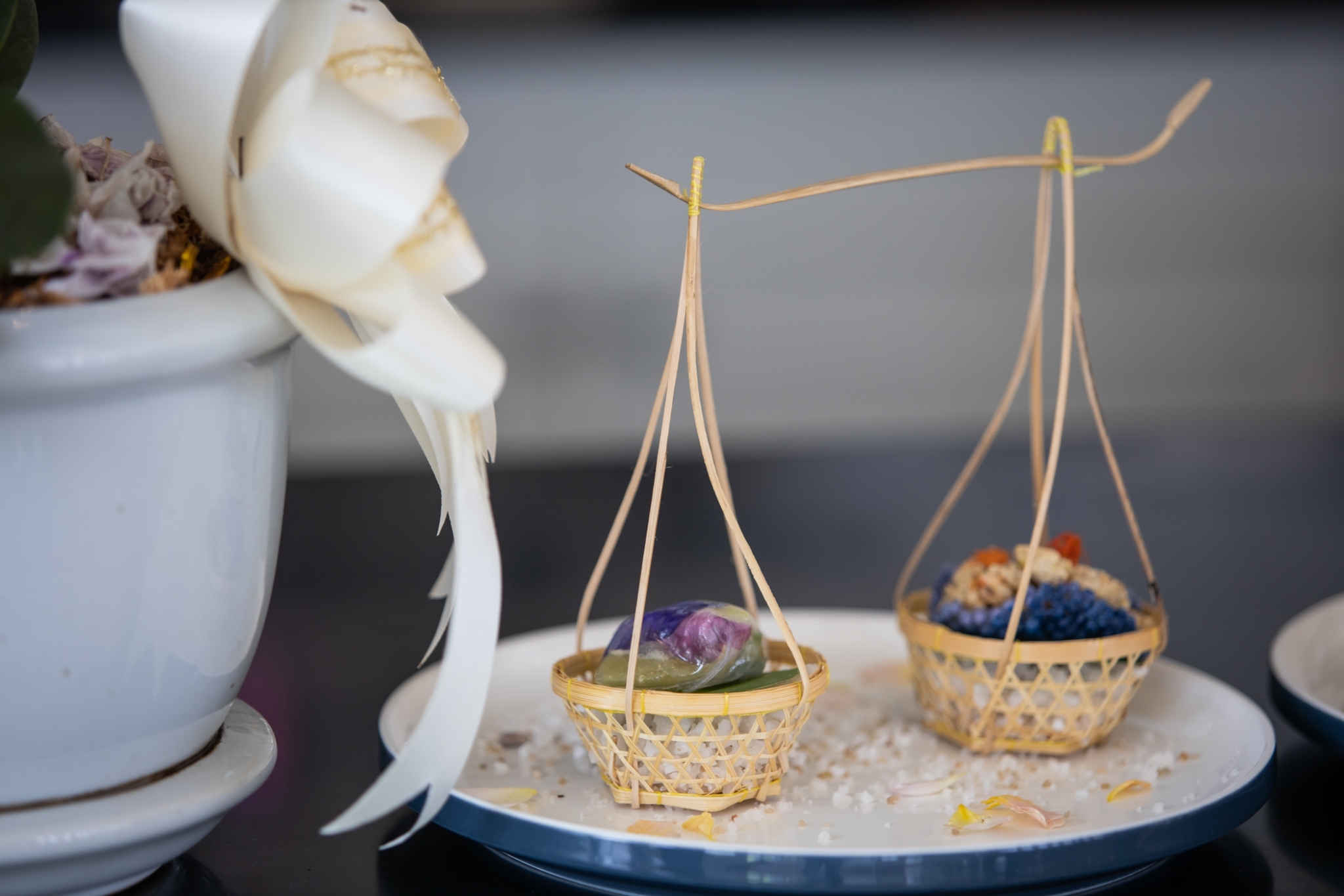 หลังจากคลายร้อนกันแล้ว ก็มาเริ่มต้นอาหารจานแรกกันด้วยออเดิฟรองท้องเบา ๆ “กระทงทอง และเมี่ยงดอกไม้” อาหารว่างไทยโบราณที่หาทานยากในยุคนี้ โดยกระทองทำจากสาคูทอดกรอบ นำมาเสิร์ฟคู่กับเมี่ยงดอกไม้ ที่ห่อด้วยกลีบกุหลาบและอัญชัญ เป็นเมนูสุขภาพจากดอกไม้ที่กินได้ เมื่อทานคู่กันแล้วจะได้รสชาติกลมกล่อมลงตัว