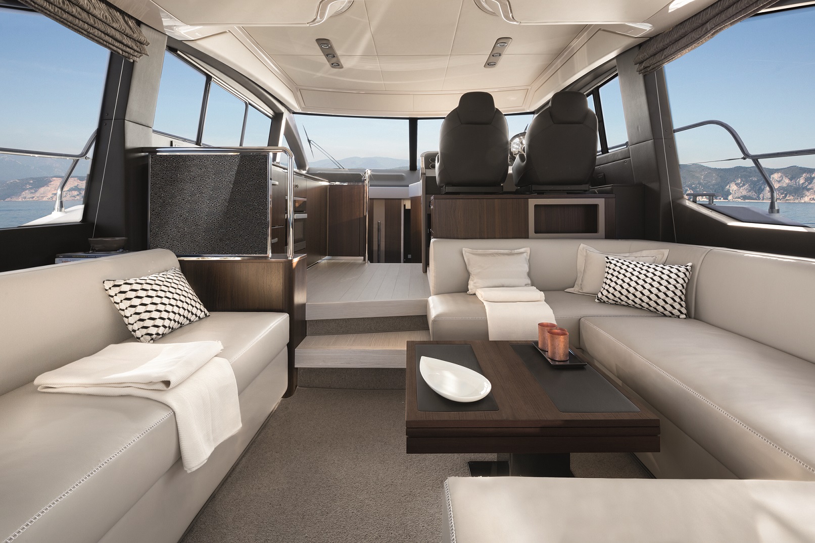 นำเสนอประสบการณ์พิเศษสำหรับครอบครัว ด้วยพื้นที่ใช้สอยกว้างขวางและสะดวกสบาย มาพร้อมกระจกบานใหญ่รอบทิศ ที่ช่วยสร้างความรู้สึกปลอดโปร่ง และดื่มด่ำกับความงดงามทิวทัศน์ได้ไกลสุดสายตา เมื่อก้าวสู่ห้องโถงภายในเรือ ก็พบกับเลานจ์พร้อมโซฟาขนาดใหญ่และโต๊ะกาแฟที่หันไปทางโทรทัศน์แบบเลื่อนเก็บอัตโนมัติเมื่อไม่ใช้งาน ผสมผสานวัสดุชั้นเลิศและการเลือกใช้โทนสีที่ดูดีมีระดับ กับไม้โอ๊คสีเข้ม ตัดกับผ้าสีขาวงาช้างและสีน้ำตาลสุดหรู