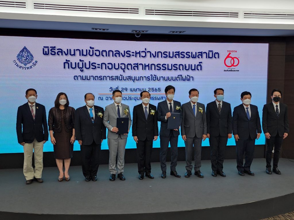 มร. โนริอากิ ยามาชิตะ กรรมการผู้จัดการใหญ่ บริษัท โตโยต้า มอเตอร์ ประเทศไทย จำกัด นายนินนาท ไชยธีรภิญโญ ประธานคณะกรรมการ บริษัท โตโยต้า มอเตอร์ ประเทศไทย จำกัด พร้อมด้วยคณะผู้บริหารระดับสูงขององค์กร เข้าเป็นตัวแทนใน “พิธีลงนามข้อตกลงระหว่างกรมสรรพสามิตกับผู้ประกอบอุตสาหกรรมรถยนต์” เพื่อตอกย้ำความมุ่งมั่นขององค์กรในการส่งเสริมการใช้ยานยนต์ไฟฟ้า สอดคล้องกับมาตรการสนับสนุนการใช้ยานยนต์ไฟฟ้าของ คณะกรรมการนโยบายยานยนต์ไฟฟ้าแห่งชาติ โดยมีนายอาคม เติมพิทยาไพสิฐ รัฐมนตรีว่าการกระทรวงการคลัง นายลวรณ แสงสนิท อธิบดีกรมสรรพสามิต นายณัฐกร อุเทนสุต ที่ปรึกษาด้านพัฒนาระบบควบคุมทางสรรพสามิต นายเกรียงไกร พัฒนาภรณ์ ผู้อำนวยการสำนักมาตรฐานและพัฒนาการจัดเก็บภาษี 2 ร่วมลงนามและเป็นสักขีพยาน ในวันศุกร์ที่ 29 เมษายน 2565 ณ อาคารหอประชุม กรมสรรพสามิต