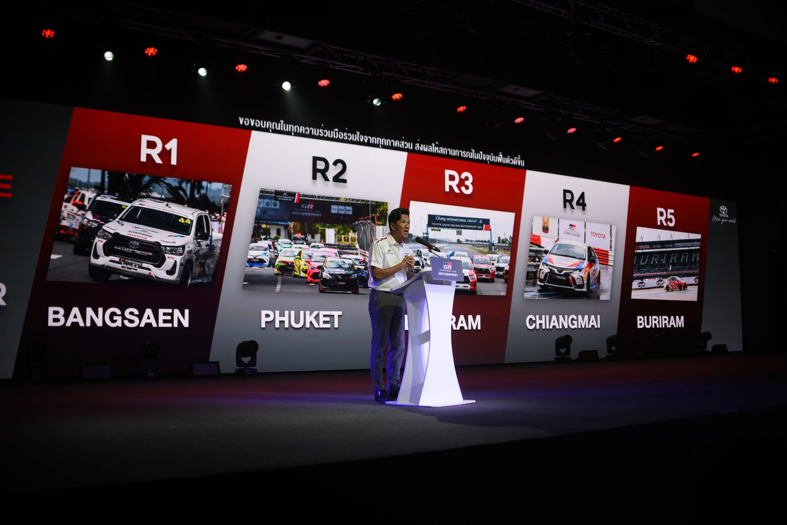 มร.โนริอากิ ยามาชิตะ กล่าวปิดท้ายว่า “การจัดกิจกรรมในปีนี้ นอกจากแสดงให้เห็นถึงศักยภาพของรถยนต์โตโยต้า ทั้งในด้านคุณภาพ ความทนทาน และความน่าเชื่อถือ ผ่านกิจกรรมการแข่งขัน One Make Race ในปีนี้ยังเป็นครั้งแรกที่เราส่ง Corolla ALTIS GR Sport ลงทำการแข่งขัน ยิ่งไปกว่านั้นทุกท่านจะได้มีโอกาสพบกับ Toyota GR Supra รถสปอร์ตในตำนานที่พร้อมเปิดประสบการณ์สัมผัสการ Drift อันน่าตื่นเต้น ด้วยการทดลองนั่งคู่กับนักแข่งมืออาชีพผู้ผ่านการแข่งขันระดับโลก ยิ่งไปกว่านั้นเรารู้สึกยินดีเป็นอย่างยิ่งที่การจัดการแข่งขัน Toyota Gazoo Racing จะสามารถช่วยกระตุ้นเศรษฐกิจในพื้นที่กับการแข่งขันทั้ง 5 สนาม ใน 4 ภูมิภาค หลังจากที่ซบเซาจากการระบาดของ COVID-19 มาอย่างยาวนาน เราหวังว่ากิจกรรมนี้จะสามารถกระตุ้นการท่องเที่ยวในท้องถิ่นได้เป็นอย่างดี