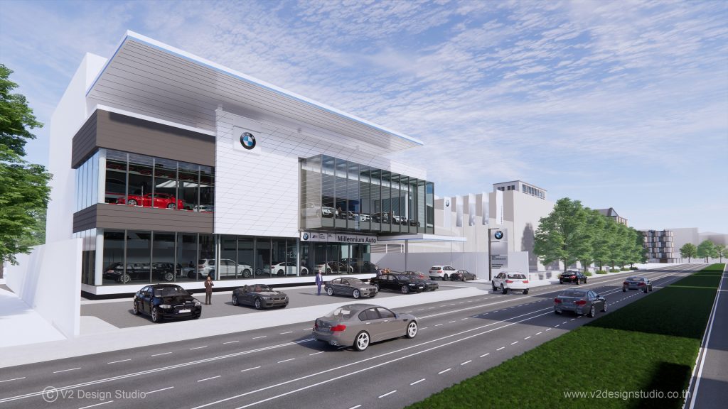 แนวคิดทางการออกแบบดังกล่าว ได้รับการถ่ายทอดสู่แฟลกชิปโชว์รูม บีเอ็มดับเบิลยู มิลเลนเนียม ออโต้ พัฒนาการ-ศรีนครินทร์ เริ่มจาก Architectural Façade ที่จัดวางกล่องกระจกระนาบแนวนอนขนาดใหญ่ ในลักษณะที่เหมือนกำลังลอยเคลื่อนออกจากกัน (Floating Box)