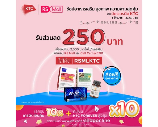 “เคทีซี” หรือ บริษัท บัตรกรุงไทย จำกัด (มหาชน) จับมือ “อาร์เอส มอลล์” (RS Mall) แพลตฟอร์มช้อปปิ้งออนไลน์ที่นำเสนอผลิตภัณฑ์อาหารเสริมเพื่อสุขภาพและความงาม ที่ได้รับการการันตีคุณภาพ โดยสินค้าทั้งหมดที่นำมาจำหน่าย ผ่านการรับรองมาตรฐานจากองค์การอาหารและยา (อย.) พร้อมส่งฟรีทุกรายการไม่มีขั้นต่ำ รับส่วนลด 250 บาท เมื่อช้อปสินค้าผ่านแอปฯ RS Mall และ Call Center 1781 ครบ 2,000 บาทขึ้นไป/ยอดซื้อ (เฉพาะการชำระแบบเต็มจำนวน) โดยระบุรหัสส่วนลด “RSMLKTC” ระหว่างวันที่ 1 มิถุนายน – 31 ธันวาคม 2565 รายละเอียดเพิ่มเติมhttps://ktc.today/RS-Mall พิเศษ แลกรับเครดิตเงินคืน 10% เมื่อใช้คะแนน KTC FOREVER เท่ากับยอดค่าใช้จ่ายออนไลน์ต่อรายการ และรับคะแนน KTC FOREVER สูงสุด x10 เท่า ลงทะเบียน www.ktc.co.th/shoponline ตั้งแต่วันที่ 1 กุมภาพันธ์ – 30 กันยายน 2565