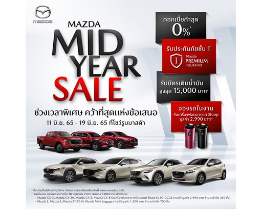 ทั้งนี้ มาสด้าได้เร่งเติมความสุขให้กับลูกค้าในช่วงกลางปี ส่งสองแคมเปญ ทั้ง “MAZDA MID YEAR SALE” ช่วงเวลาพิเศษ คว้าที่สุดแห่งข้อเสนอ ระหว่างวันที่ 11 – 19 มิถุนายน 2565 ให้กับลูกค้าที่ต้องการออกรถใหม่ ดอกเบี้ยต่ำสุด 0%1 ฟรีประกันภัยชั้น 1 Mazda Premium Insurance1 ฟรีบัตรเติมน้ำมันมูลค่าสูงสุด 15,000 บาท1 และรับฟรีของพรีเมี่ยมสุดพิเศษ2