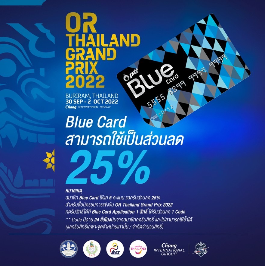 โดยโออาร์ ได้เตรียมสิทธิพิเศษในการซื้อบัตร สำหรับแฟนมอเตอร์สปอร์ตและเป็นสมาชิกบัตร Blue Card เพียงใช้คะแนน Blue Card เพียง 5 คะแนน แลกรับส่วนลด 25% สำหรับซื้อบัตรเข้าชมการแข่งขัน OR Thailand Grand Prix 2022 ซึ่งจะเริ่มมีการจำหน่ายตั้งแต่ วันศุกร์ที่ 8 กรกฎาคม 2565 เป็นวันแรก โดยสามารถกดรับสิทธิ์ได้ที่ Blue Card Application สำหรับใครที่ยังไม่เป็นสมาชิกก็สามารถสมัครเป็นสมาชิก Blue Card ได้ฟรีที่ www.pttbluecard.com หรือสมัครด้วยตัวเองได้ที่ PTT Station และร้านค้าในเครือ โออาร์ ทั่วประเทศ