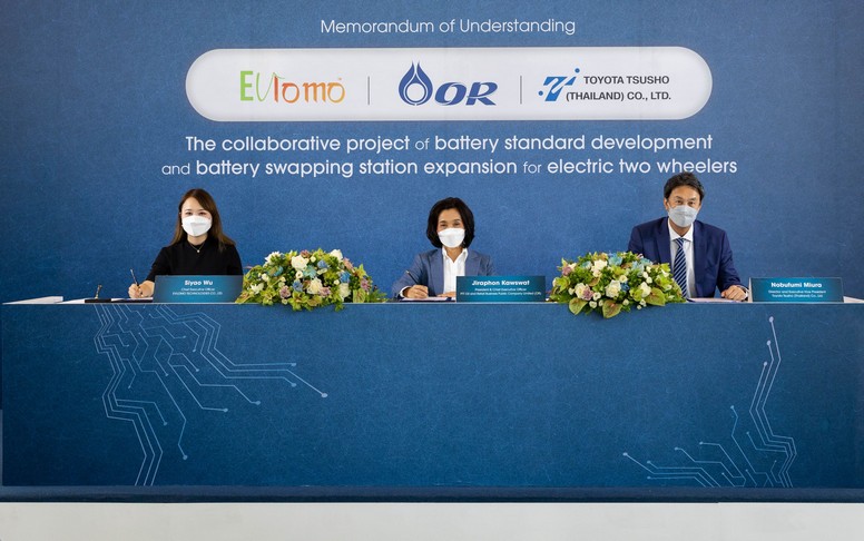 โออาร์ ผู้นำด้านธุรกิจน้ำมันและค้าปลีกในประเทศไทย, โตโยต้า ทูโช พันธมิตรการค้าจากเครือโตโยต้ากรุ๊ป และ อีวีโลโม ผู้นำด้านธุรกิจการให้บริการและโครงสร้างพื้นฐานของพลังงานและการคมนาคมด้วยไฟฟ้าที่มีวิสัยทัศน์ที่จะสร้างสังคมที่ยั่งยืน ได้จับมือเซ็นสัญญา MoU ร่วมมือกันพัฒนามาตรฐานแบตเตอรี่และการขยายบริการสถานีสลับแบตเตอรี่ในรูปแบบ Mobility-as-a Service (MaaS) สำหรับจักรยานยนต์ไฟฟ้าสองล้อ