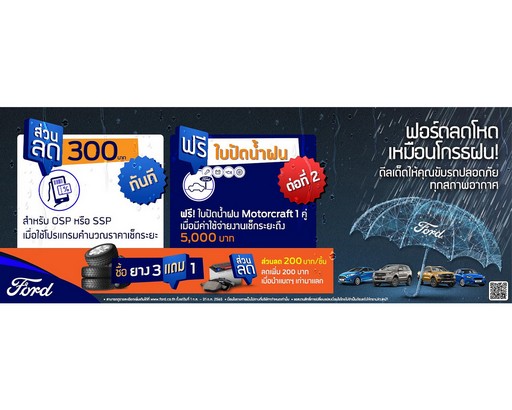 - รับใบปัดน้ำฝน Motorcraft คู่หน้าฟรี เมื่อมีค่าใช้จ่ายงานเช็คระยะตั้งแต่ 5,000 บาท สำหรับลูกค้ารถยนต์ฟอร์ดทุกรุ่น ยกเว้นรถฟอร์ดเรนเจอร์ เจเนอเรชันใหม่ และ ฟอร์ด เทอริทอรี จะได้รับใบปัดน้ำฝนคู่หน้ารุ่นเดียวกับที่ติดตั้งจากโรงงาน โดยฟอร์ดยังมอบบริการพ่นฆ่าเชื้อภายในรถยนต์ฟรี