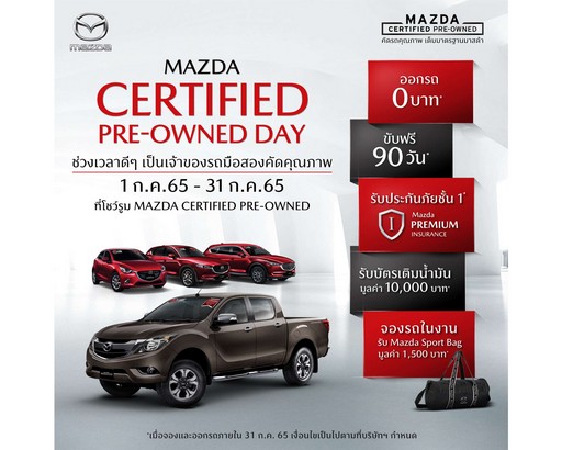 นอกจากจะมุ่งมั่นดูแลลูกค้ารายใหม่ที่กำลังจะเข้าสู่ครอบครัวมาสด้าแล้ว มาสด้ายังเอาใจใส่ดูแลลูกค้าเก่าอย่างใกล้ชิด เพื่อให้ลูกค้ามีทางเลือกที่ดีกว่า โดยลูกค้าที่ใช้รถยนต์มาสด้าอยู่แล้วสามารถนำรถมาเทรดอินกับรถใหม่ป้ายแดงหรือรถมือสองคุณภาพดี ที่ผ่านการรับรองมาตรฐานด้วยการตรวจสอบคุณภาพกว่า 119 จุด ภายใต้โครงการ MAZDA CERTIFIED PRE-OWNED กับแคมเปญ MAZDA CERTIFIED PRE-OWNED DAY ช่วงเวลาดีๆ เป็นเจ้าของรถมือสองคัดสรรคุณภาพที่ดีที่สุด มาพร้อมข้อเสนอออกรถเพียง 0 บาท*, ขับฟรี 90 วัน*, รับประกันภัยชั้น 1 Mazda Premium Insurance*, รับบัตรเติมน้ำมัน มูลค่า 10,000 บาท* และพิเศษจองรถในงานฯ รับ Mazda Sport Bag มูลค่า 1,500 บาท* ระหว่างวันที่ 1-31 ก.ค. 65 ที่โชว์รูม MAZDA CERTIFIED PRE-OWNED ทั่วประเทศ