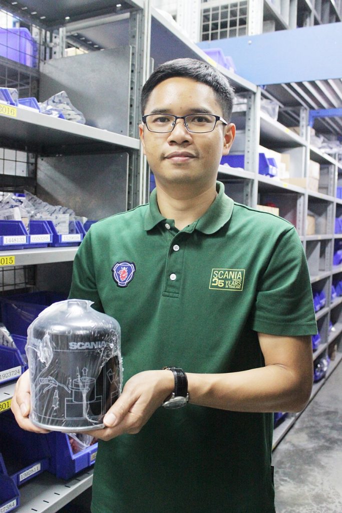 “อะไหล่พื้นฐานที่เปลี่ยนกันบ่อย เช่น ชุดไส้กรองต่าง ๆ พวกกรองน้ำมันเครื่อง กรองอากาศ ซึ่งกรองต่าง ๆ มีส่วนสำคัญ เพราะถ้ากรองไม่ได้คุณภาพ อาจเกิดอาการอุดตัน มีเศษฝุ่น เศษอะไรต่าง ๆ หลุดลงไปในเครื่องยนต์หลักได้ ส่งผลให้การขนส่งเสียหาย แต่หากใช้อะไหล่และงานบำรุงรักษาตามมาตรฐานของสแกนเนีย ปัญหาเหล่านี้ก็จะหมดไป ปัจจุบันรถสแกนเนียสามารถเปลี่ยนถ่ายน้ำมันเครื่องได้สูงสุดถึงประมาณ 80,000 กิโลเมตรต่อรอบ ซึ่งหากเทียบกับแบรนด์จากประเทศในเอเชียอื่น ๆ อาจต้องเปลี่ยนถ่ายน้ำมันเครื่องทุก ๆ 15,000 ถึง 25,000 กิโลเมตรต่อครั้ง เมื่อมองถึงภาพรวมในการดำเนินธุรกิจ (Total Operating Economy) แล้ว คุ้มค่ากว่ามาก นอกจากนั้นหากต้องการนำรถมาขายเป็นมือสอง การที่ใช้อะไหล่แท้จากสแกนเนียก็จะทำให้รถคงประสิทธิภาพดีและหากมีประวัติงานซ่อมกับศูนย์บริการ ราคาขายต่อก็ยิ่งดีขึ้น”