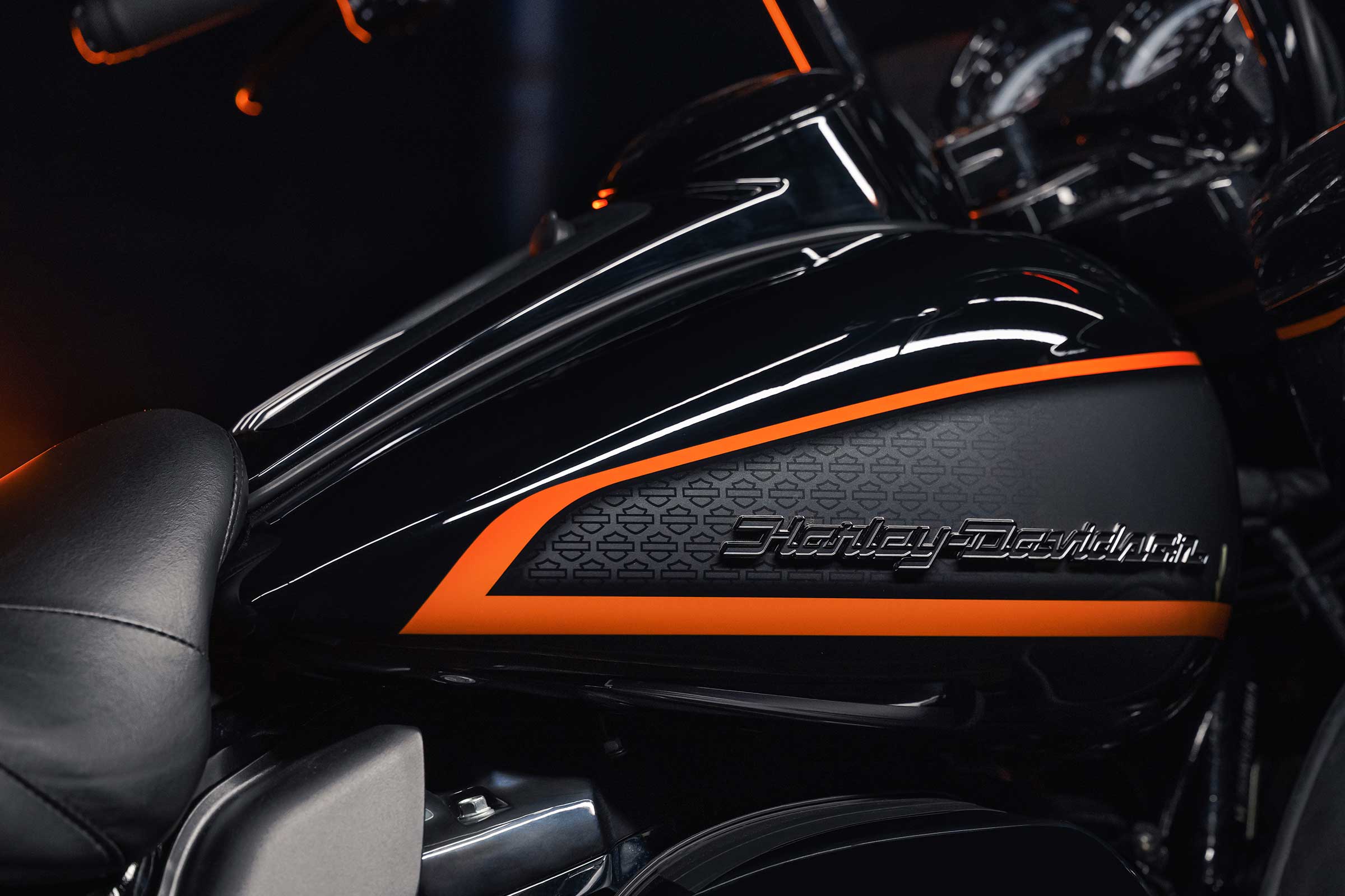 กราฟฟิกสีคัสตอม Apex ที่อยู่บนถังน้ำมัน มีรูปร่างคล้ายคลึงกับต้นแบบบนถังน้ำมันของ Harley-Davidson® XR750 รถแข่งสำหรับสนามแข่งในตำนาน สำหรับรถมอเตอร์ไซค์รุ่นที่มีแฟริ่ง เส้นกราฟิกจะปัดข้างไปทางด้านหลังของตัวรถ ตามลายกราฟฟิกที่อยู่บนถังน้ำมัน และมีองศาของเส้นหักมุมสะท้อนถึงความเร็ว เส้นกราฟิกจะพาดเชื่อมต่อยาวตั้งแต่ด้านหน้าตัวรถ ตามบริเวณด้านข้าง ตลอดจนบนกระเป๋าข้างของตัวรถ สร้างรูปแบบเส้นที่กำลังพุ่งทะยาน แม้ในขณะที่รถมอเตอร์ไซค์จอดอยู่กับที่ กลับดูเคลื่อนไหวอย่างมีชีวิตชีวา