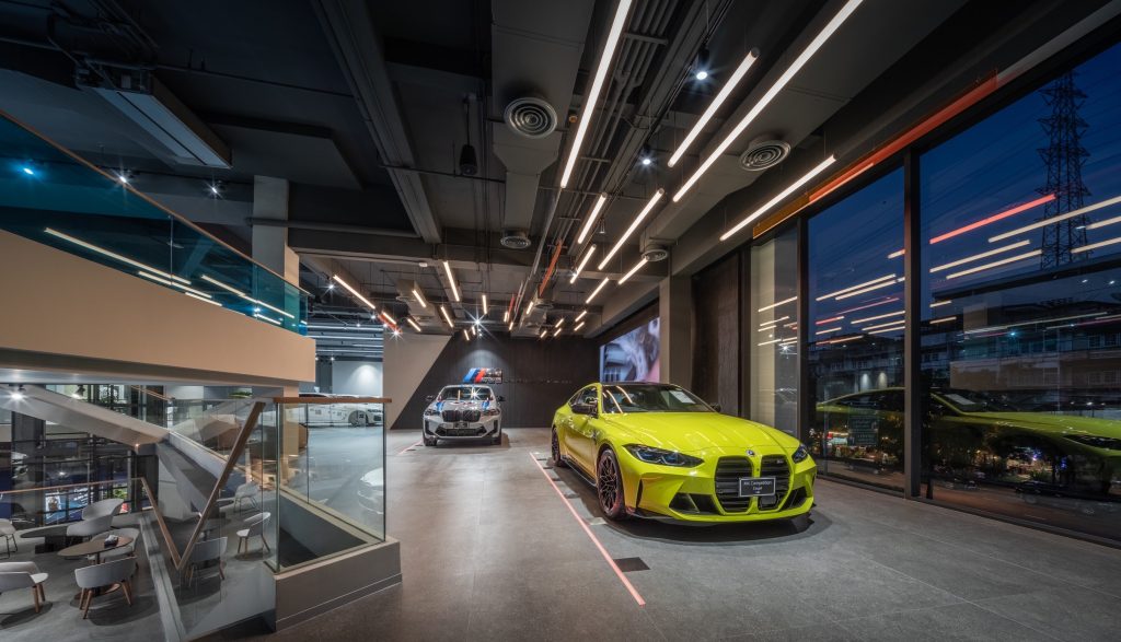 ภายใต้หลังคาแผ่นใหญ่บริเวณหน้าโชว์รูม ปกป้องลูกค้าจากแสงแดดหรือสายฝน ติดตั้งแท่นชาร์จความเร็วสูง (DC-Direct Current Charger) รองรับรถยนต์ไฟฟ้าของบีเอ็มดับเบิลยู โถงจัดแสดงหลักชั้นล่าง สว่างไสวด้วยแสงธรรมชาติจากเพดานกระจก ขณะที่ลิฟต์แก้วบริเวณกลางโชว์รูม ช่วยให้ลูกค้าสามารถชื่นชมความโดดเด่นของโชว์รูมแห่งนี้ได้อย่างรอบด้าน สะดุดตากับห้องส่งมอบรถยนต์ที่กั้นด้วยบานกระจกเป็นสัดส่วน ให้ความรู้สึกเป็นส่วนตัว พร้อมชุดโซฟาขนาดใหญ่ รองรับเพื่อนฝูงหรือสมาชิกครอบครัวที่มาร่วมแสดงความยินดี พร้อมติดตั้งจอแอลอีดีขนาดใหญ่ ที่สามารถแสดงภาพและใช้งานได้หลากหลาย รวมถึงการแสดงข้อความพิเศษสำหรับลูกค้าบนจอ พร้อมกล้องที่สามารถบันทึกภาพหรือคลิปวีดิโอสร้างความประทับใจในวันพิเศษอย่างเหนือระดับ หรูหราขึ้นอีกขั้นด้วยเปียโนหลังใหญ่สร้างความเพลิดเพลินให้กับผู้มาเยี่ยมเยือน ด้านเจ้าหน้าที่ของโชว์รูมพร้อมให้การต้อนรับอย่างเป็นกันเอง รวมถึงแผนกต่าง ๆ ที่เชื่อมต่อกันอยู่รายรอบ เพื่อมอบบริการชั้นเลิศให้กับลูกค้า