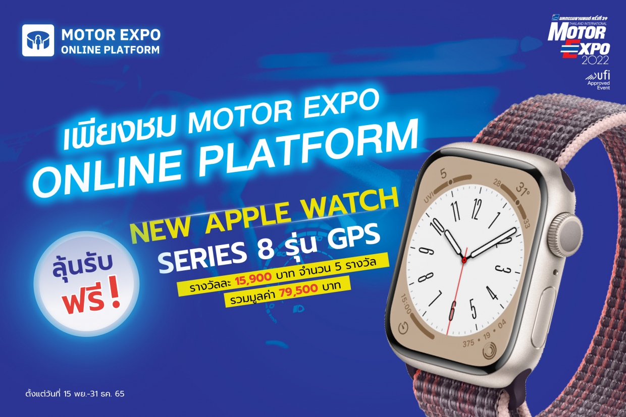5.“ชม MOTOR EXPO ONLINE PLATFORM ชิงรางวัล” ผู้ชมงาน MOTOR EXPO ONLINE PLATFORM ผ่านลิงค์จาก https://op.motorexpo.co.th ตั้งแต่วันที่ 15 พฤศจิกายน 2565 – 31 ธันวาคม 2565 มีสิทธิ์ลงทะเบียนเพื่อชิงรางวัล NEW APPLE WATCH SERIES 8 รุ่น GPS (ตัวเรือน 41 มม.) รางวัลละ 15,900 บาท จำนวน 5 รางวัล รวมมูลค่า 79,500 บาท