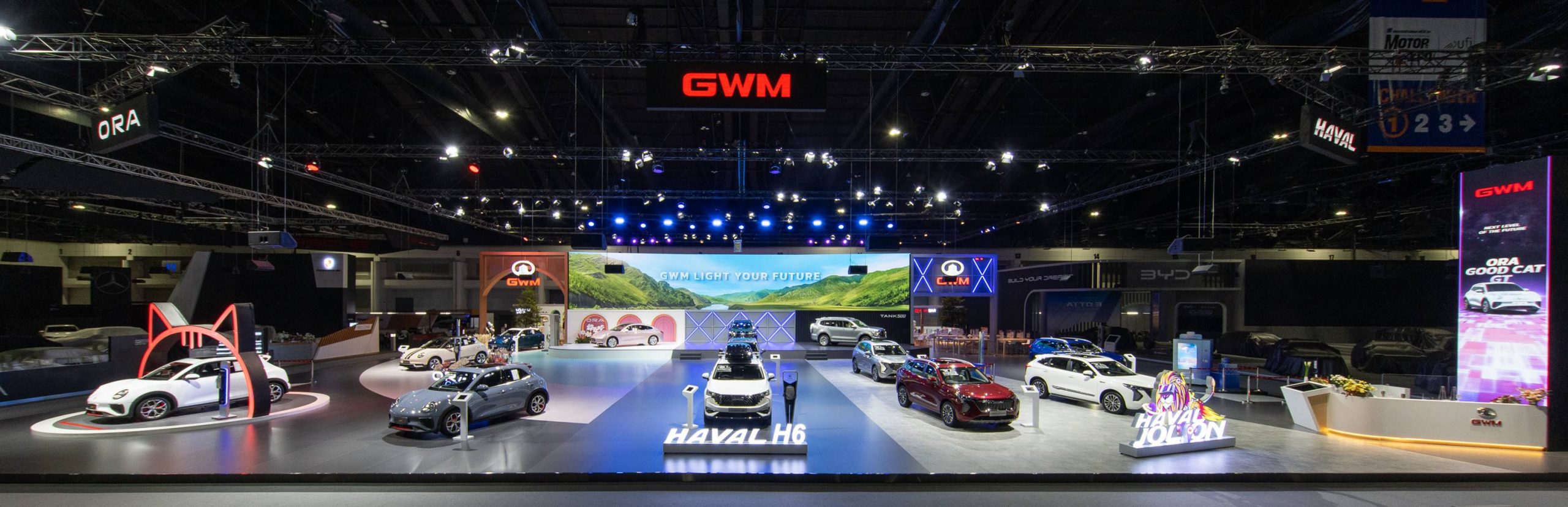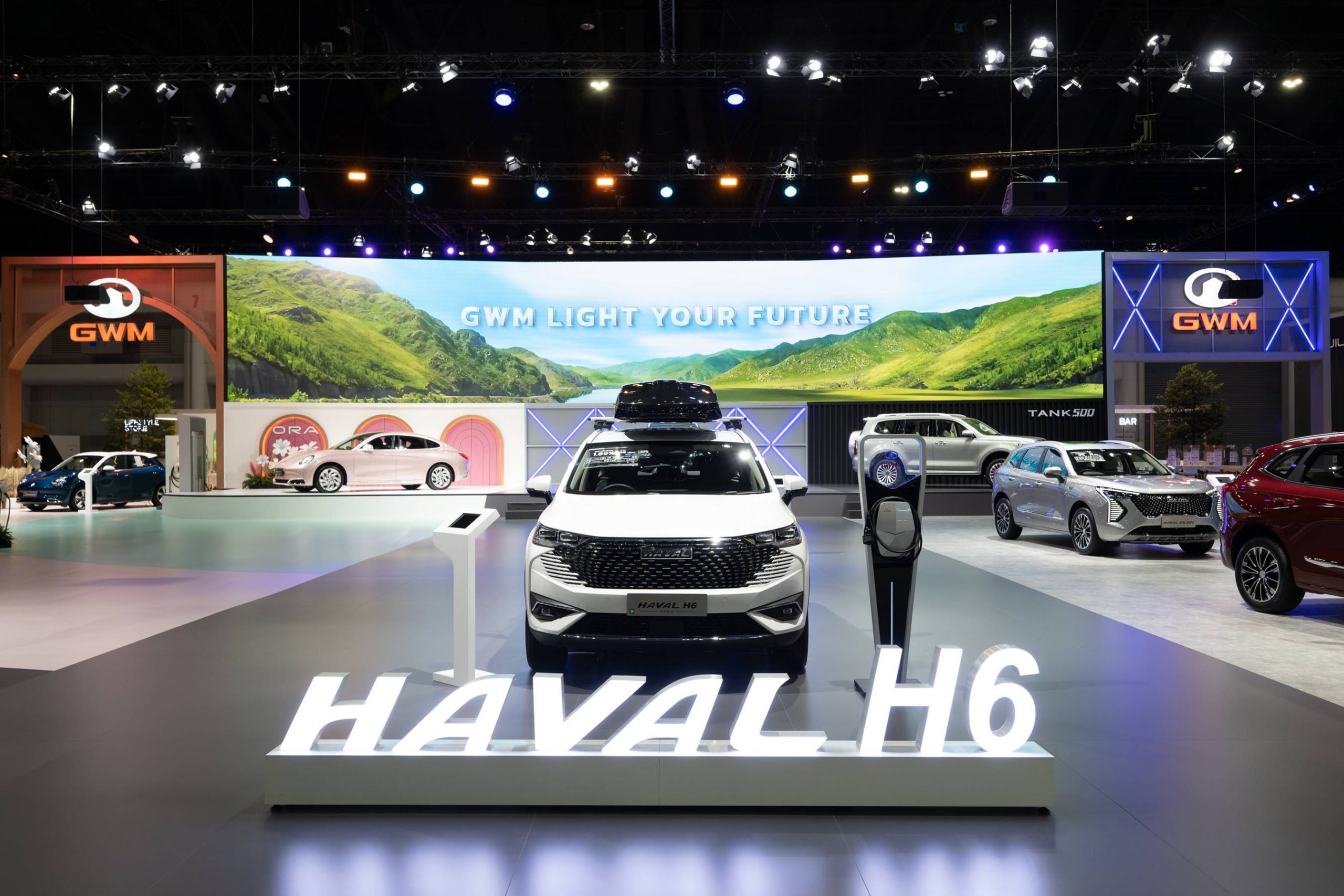 เกรท วอลล์ มอเตอร์ สร้างสีสันสะกดสายตาผู้เข้าชมงานมหกรรมยานยนต์ ครั้งที่ 39 ด้วยบูธจัดแสดงภายใต้คอนเซ็ปต์ ‘GWM Light the Future’ ที่รวบรวมนวัตกรรมยานยนต์แห่งอนาคตมาให้ผู้บริโภคชาวไทยได้สัมผัสอย่างใกล้ชิด นำทัพโดยเจ้าเหมียวคูเป้ไฟฟ้า ORA Grand Cat ที่มาเผยโฉมในประเทศไทยเป็นครั้งแรก พร้อมด้วย เจ้าเหมียวไฟฟ้าสไตล์สปอร์ตสุดหรู ORA Good Cat GT ที่กลับมาเปิดให้จับจองเป็นเจ้าของได้อีกครั้งกับสีขาว Hamilton White รวมไปถึง New HAVAL H6 Hybrid SUV โฉมใหม่ที่หรูหรายิ่งขึ้น และการกลับมาปรากฏตัวอีกครั้งของรถยนต์เอสยูวีออฟโรดสุดฮอตที่เคยเป็นที่ฮือฮาอย่างมากในหมู่นักขับขี่สายลุย TANK 500 HEV ตามด้วยขบวนพาเหรดรถยนต์เอสยูวียอดนิยมหลากหลายรุ่นที่มีวางจำหน่ายแล้วในประเทศไทย ทั้ง HAVAL H6 Hybrid SUV เจ้าตลาดที่ครองความเป็นผู้นำในกลุ่มรถยนต์คอมแพคเอสยูวีมาตลอดทั้งปี All New HAVAL H6 Plug-in Hybrid SUV รถยนต์เอสยูวีพลังงานไฟฟ้าแบบเสียบปลั๊กรุ่นใหม่ล่าสุดที่เพิ่งเปิดตัวไปเมื่อต้นเดือนตุลาคมที่ผ่านมา และ HAVAL JOLION Hybrid SUV เจ้าสิงโตอารมณ์ดีที่ยังคงได้รับความนิยมอย่างต่อเนื่อง
