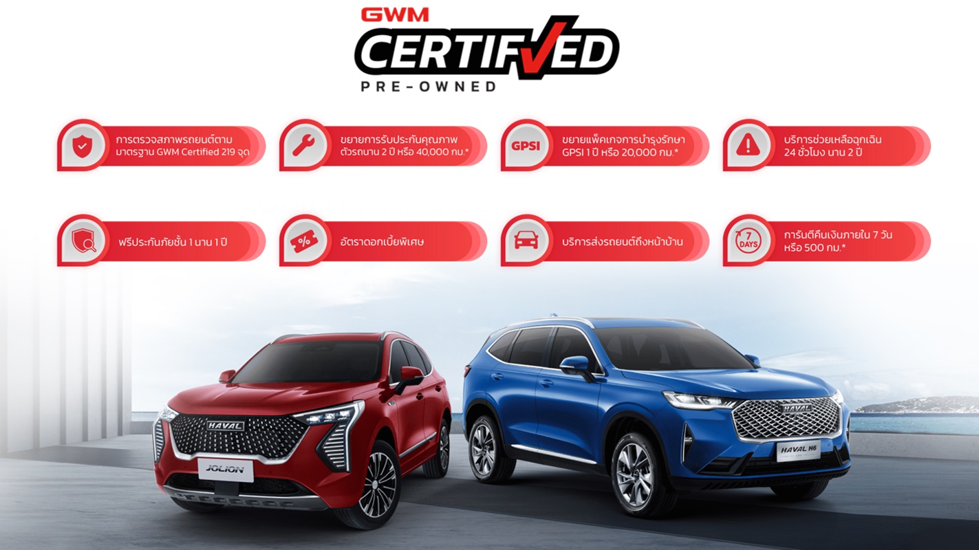 - ด้านธุรกิจ Used Car : ในปี 2566 เกรท วอลล์ มอเตอร์ จะเปิดดำเนินการธุรกิจรถใช้แล้ว โดยให้บริการลูกค้าอย่างครบวงจร รองรับลูกค้าที่ต้องการเปลี่ยนรถและลูกค้าที่มองหารถยนต์ใช้แล้วที่มีคุณภาพของ เกรท วอลล์ มอเตอร์ รวมทั้งมีบริการประเมินราคารถใช้แล้วง่าย ๆ ผ่านทางเว็บไซต์ GWM.CO.TH โดยมาตรฐานรถใช้แล้วของ GWM Certified Pre-Owned ประกอบไปด้วย 4 ส่วน คือ การตรวจสอบคุณภาพตามมาตรฐาน 219 จุด อายุรถไม่เกิน 5 ปี เลขไมล์ไม่เกิน 150,000 กิโลเมตร ไม่มีประวัติน้ำท่วม ไฟไหม้ และไม่มีประวัติชนหนัก ซึ่งมาพร้อมกับสิทธิประโยชน์มากมาย อาทิ