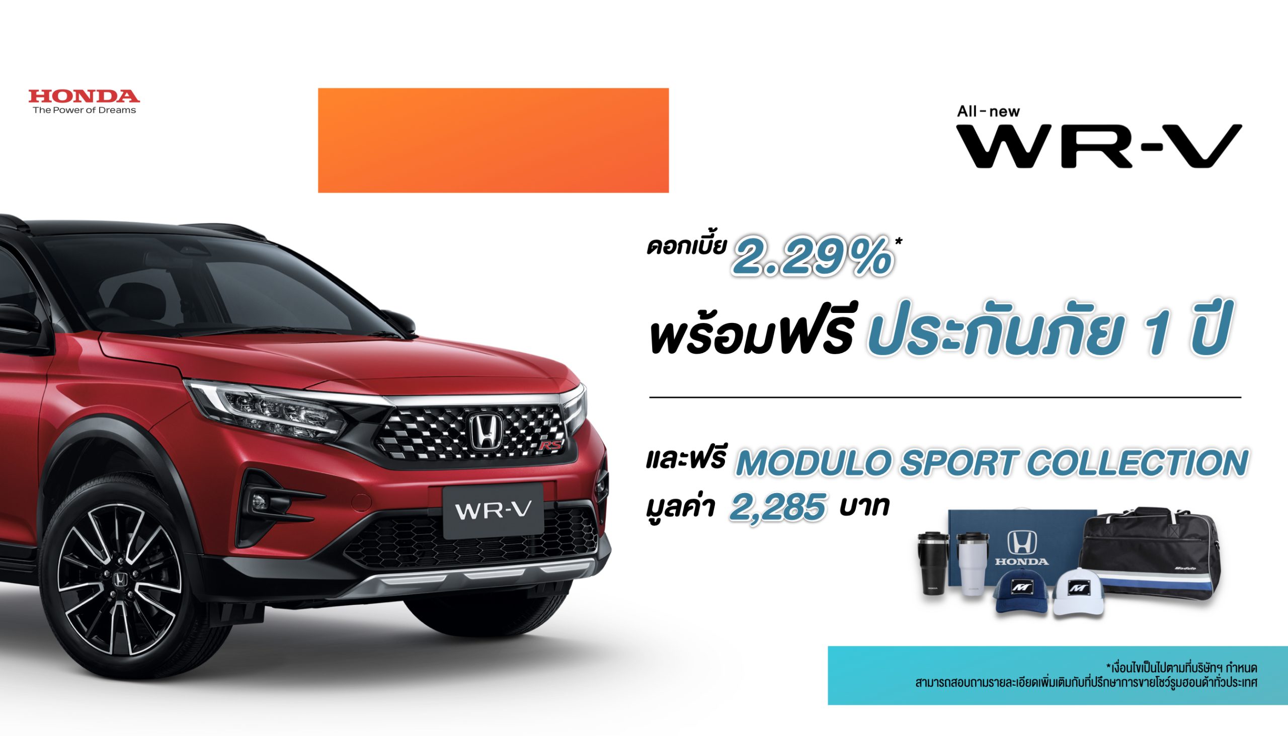 อีกครั้ง โดดเด่นด้วยดีไซน์สปอร์ตสุดเท่ มีสไตล์ แข็งแกร่ง และให้ความรู้สึกพรีเมียม ทันสมัย ตามสไตล์ชีวิตยุคใหม่ ห้องโดยสารกว้างขวาง พร้อมเบาะนั่งด้านหลังแถว 2 ปรับพับได้ เพิ่มพื้นที่ใช้สอยอเนกประสงค์ แรงได้สุดสนุกได้ทุกเส้นทางด้วยเครื่องยนต์ขนาด 1.5 ลิตร DOHC i-VTEC ผสานเกียร์อัตโนมัติ CVT ให้กำลังสูงสุด 121 แรงม้า ให้อัตราประหยัดน้ำมันที่ดี 16.7 กม./ลิตร รองรับพลังงานทางเลือก E20 ขับขี่ปลอดภัยมั่นใจด้วยเทคโนโลยีความปลอดภัยอัจฉริยะ ฮอนด้า เซนส์ซิ่ง (Honda SENSING) ในทุกรุ่นย่อย และเทคโนโลยีเพื่อความสะดวกสบายและความปลอดภัยอื่น ๆ* ที่พร้อมตอบทุกการใช้งานที่หลากหลายตอบรับทุกวิถีชีวิตยุคใหม่ ให้คุณได้มีวันพิเศษที่สร้างเองได้ทุกวัน พร้อมข้อเสนอพิเศษ ฟรีประกันภัย 1 ปี** ดอกเบี้ย 2.29%** และฟรี Modulo Sport Collection มูลค่า 2,285 บาท** เมื่อจองและรับรถยนต์ ตั้งแต่วันที่ 10 มีนาคม 2566 ถึงวันที่ 31 พฤษภาคม 2566** ลูกค้าที่สนใจสามารถสัมผัส “ฮอนด้า ดับเบิลยูอาร์-วี ใหม่” ได้ที่โชว์รูมฮอนด้าทั่วประเทศ ตั้งแต่วันที่ 10 มีนาคม 2566 เป็นต้นไป และงานบางกอก อินเตอร์เนชั่นแนล มอเตอร์โชว์ ครั้งที่ 44