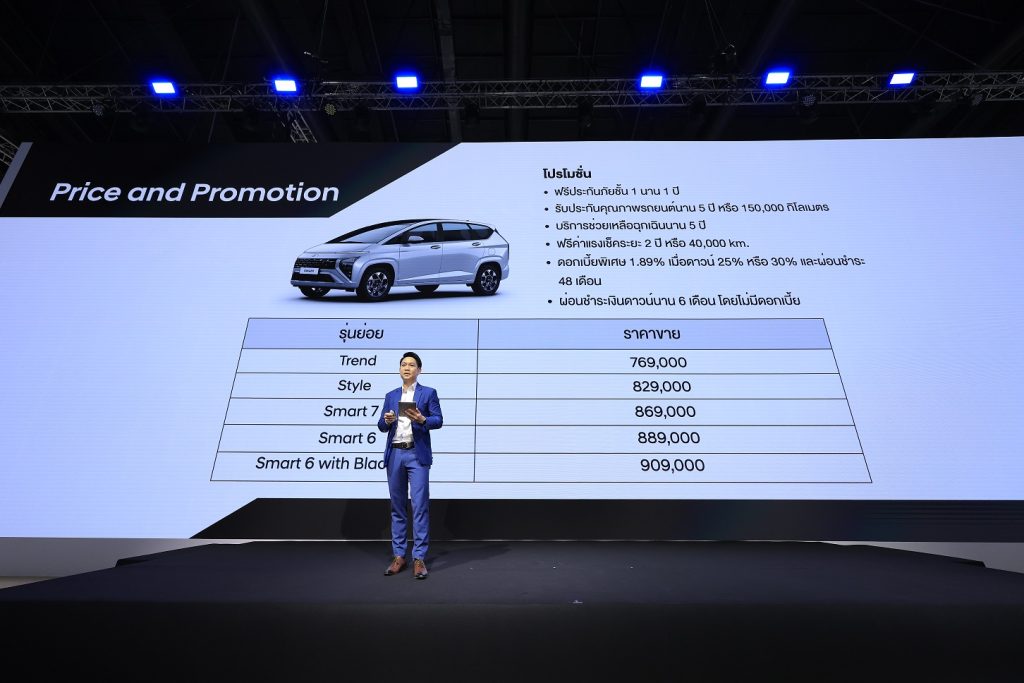 ฮุนได สตาร์เกเซอร์ พร้อมจำหน่าย 4 รุ่นย่อย ได้แก่ รุ่นเทรนด์, สไตล์, สมาร์ท 7 และ สมาร์ท 6 เปิดให้จองพร้อมกัน ณ งานบางกอก อินเตอร์เนชั่นแนล มอเตอร์โชว์ 22 มีนาคม – 2 เมษายน 2566 ณ อาคารชาเลนเจอร์ อิมแพค เมืองทองธานี