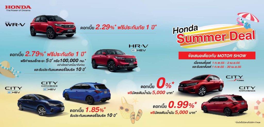 ลูกค้าที่สนใจสามารถเยี่ยมชมบูทฮอนด้า (A9) ภายในงานบางกอก อินเตอร์เนชั่นแนล มอเตอร์โชว์ครั้งที่ 44 หรือ Motor Show 2023 ณ อาคารชาเลนเจอร์ฮอลล์ 2 อิมแพ็ค เมืองทองธานี ระหว่างวันที่ 22 มีนาคม – 2 เมษายน 2566 มาพร้อมแคมเปญ Honda Summer Deal** เมื่อจองรถยนต์ตั้งแต่ 1 กุมภาพันธ์ – 2 เมษายน 2566 และรับรถยนต์ตั้งแต่ 1 กุมภาพันธ์ – 30 เมษายน 2566 และข้อเสนอสุดพิเศษที่แตกต่างกันสำหรับรถยนต์แต่ละรุ่นได้ทั้งในงานฯ และโชว์รูมฮอนด้าทั่วประเทศ สามารถสอบถามข้อมูลเพิ่มเติมได้ที่ศูนย์บริการข้อมูลฮอนด้า 24 ชั่วโมง โทร 0 2341 7777 หรือดูรายละเอียดเพิ่มเติมหรือแชทกับที่ปรึกษาการขายทางออนไลน์ผ่านเว็บไซต์ www.honda.co.th ทั้งนี้ ลูกค้าสามารถทดลองขับได้ที่โชว์รูมฮอนด้าทั่วประเทศ โดยลูกค้าที่ลงทะเบียนและร่วมกิจกรรมทดลองขับทาง www.honda.co.th/testdrive ตั้งแต่วันที่ 1 กุมภาพันธ์ – 31 มีนาคม 2566 จะได้รับของที่ระลึกจากฮอนด้า**