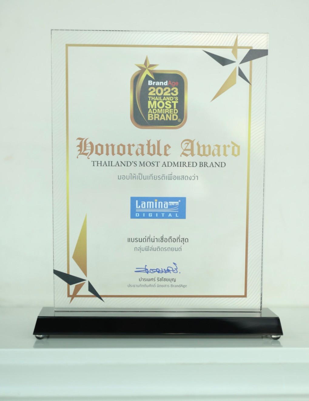 “ลามิน่าฟิล์ม” ตอกย้ำความเป็นแบรนด์ฟิล์มกรองแสงรถยนต์อันดับ 1 ในใจผู้บริโภค ได้รับรางวัล Thailand’s Most Admired Brand 2023 หรือรางวัลตราสินค้าที่ผู้บริโภคเชื่อมั่นสูงสุดในประเทศไทย ต่อเนื่องเป็นปีที่ 9 จัดโดยนิตยสารแบรนด์เอจ (BrandAge) จากกระบวนการทำวิจัยที่ผ่านการกลั่นกรองอย่างตรงไปตรงมา เพื่อผลลัพธ์ที่แม่นยำและถูกต้องตามหลักวิชาการจากคณะทำงานในทุกภาคส่วน