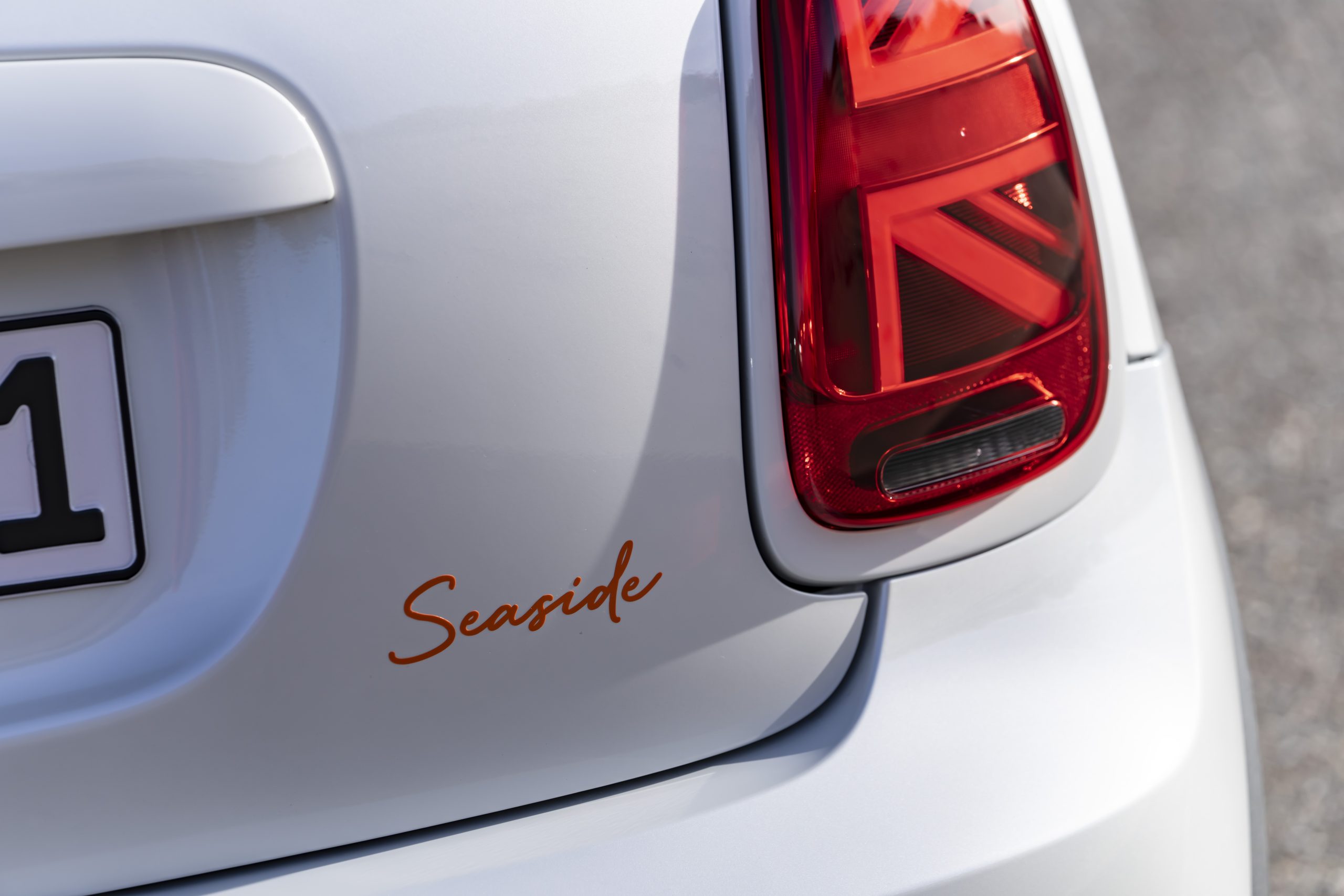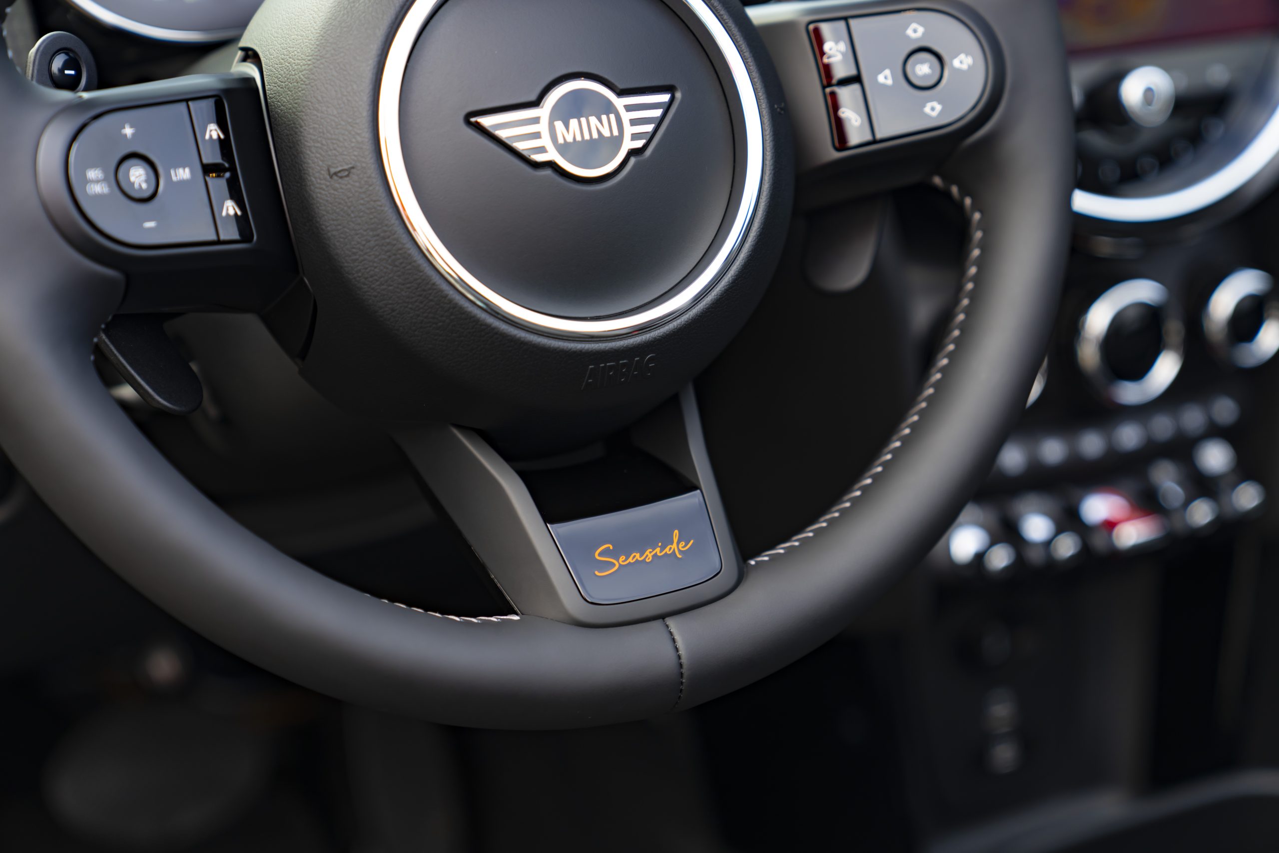 เมื่อก้าวเข้าสู่ภายในตัวรถ จะพบกับแถบสีขาวสองเส้นขนานกันที่บริเวณประตู พร้อมอักษรตกแต่งคำว่า Seaside เบาะนั่งบุด้วยหนังสีดำ Carbon Black มาพร้อมที่วางขาและแขนมอบความสะดวกสบายแบบเต็มขั้น บริเวณแผงคอนโซลด้านหน้ายังตกแต่งด้วยลายเส้น ลวดลายพิมพ์ และตัวอักษรเฉลิมฉลองการครบรอบ บริเวณด้านล่างของพวงมาลัยหุ้มหนัง Nappa ยังสลักด้วยตัวอักษร Seaside ชื่อรุ่นของมินิสุดพิเศษคันนี้ ความเป็นเอกลักษณ์ของรถยนต์มินิรุ่นนี้ยังเห็นได้จากกุญแจของรถยนต์ที่ออกแบบเป็นลายเกลียวคลื่นในสีน้ำเงินแบบเหลือบ สลักตัวอักษร “Seaside”