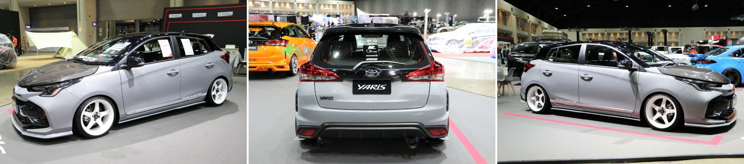 - “YARIS ชุดแต่ง SILVER BULLET” ดึงดูดทุกสายตากับชุดแต่งที่มาในสไตล์ USDM ที่ดูเรียบง่าย เน้นไปที่การจัดทรงรถให้มีความสวยงาม สะอาดตา เหมาะกับการเป็นรถใช้งานในเมืองอย่างแท้จริง โดยชุดแต่งประกอบด้วย ฝากระโปรงหน้าคาร์บอน จาก Monza Shop สเกิร์ตรอบคัน สปอยเลอร์ ล้ออัลลอย Comis XT-005R ขนาด 17×7.5 +30 ยาง Cosmis Tire ขนาด 205/45R17 โช้คอัพ Silver Neomax R ท่อไอเสีย จาก BRD และคันเร่งไฟฟ้า จาก ECU=SHOP