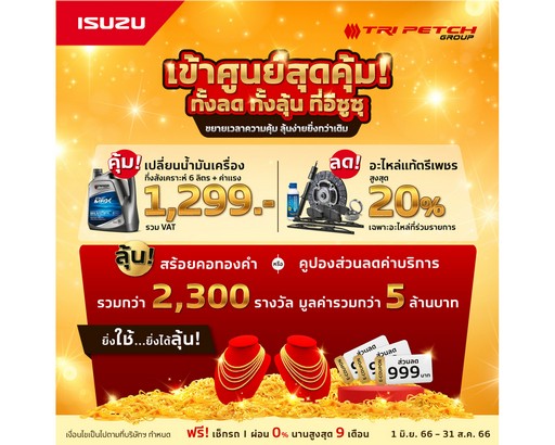 ISUZU ขยายเวลาแปญบริการสุดคุ้ม! ลุ้นรับทองคำหรือส่วนลด สำหรับลูกค้าเข้าศูนย์ทุกรุ่น