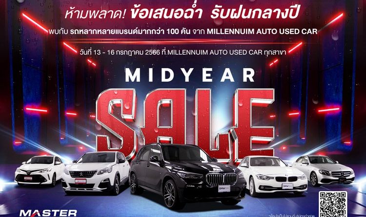 บริษัท มาสเตอร์ เซอร์ทิฟายด์ ยูสคาร์ จำกัด ศูนย์รวมรถยนต์มือสองครบวงจร ภายใต้บริษัท มิลเลนเนียม กรุ๊ป คอร์ปอเรชั่น (เอเชีย) จำกัด (มหาชน) หยิบยื่นข้อเสนอฉ่ำรับฝนกลางปี ผ่านแคมเปญ ‘MID YEAR SALE’ กับหลากหลายยนตรกรรมยอดนิยม ที่คัดสรรมาให้เลือกแบบจุใจกว่า 100 คัน ระหว่างวันที่ 13 – 16 กรกฎาคมนี้ ที่โชว์รูม มิลเลนเนียม ออโต้ ยูสคาร์ ทุกสาขา