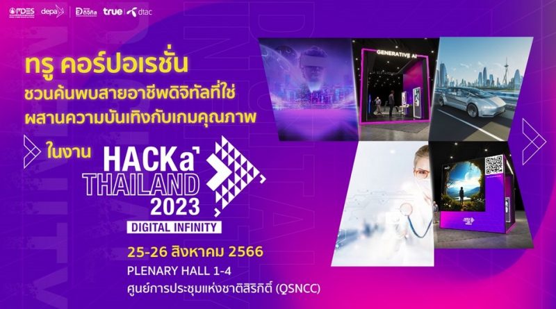 บูธของ ทรู คอร์ปอเรชั่น ในงาน HACKaTHAILAND 2023: DIGITAL INFINITY ร่วมสร้างให้ทุกโอกาสเกิดขึ้นได้ ผ่านการเสริมสร้างทักษะดิจิทัลให้กับประชาชนทุกระดับ ตลอดจนคนรุ่นใหม่เพื่อเป็นกำลังสำคัญในการเปลี่ยนผ่านประเทศไทยสู่วิถีดิจิทัล พบกับ