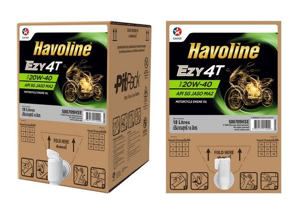 คาลเท็กซ์ ฮาโวลีน สร้างปรากฏการณ์ใหม่เผยโฉม PitPack™ นวัตกรรมบรรจุภัณฑ์น้ำมันหล่อลื่นสำหรับมอเตอร์ไซค์ ตอบโจทย์การใช้งานแบบคุ้มค่าด้วยรูปแบบถุงบรรจุในกล่องกระดาษ หรือ bag-in-a-box ลดขยะพลาสติกถึง 90% เมื่อเปรียบเทียบกับการใช้ขวดแบบใช้ครั้งเดียวทิ้ง โดยนำร่องแนะนำแพ็กเกจใหม่สำหรับน้ำมันเครื่องคาลเท็กซ์ ฮาโวลีน อีซี่ 4ที SAE 20W-40 (Caltex Havoline Ezy 4T SAE 20W-40)