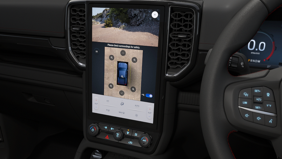 เมื่อกดปุ่มออฟโรดบนคอนโซลกลาง ข้อมูลจะแสดงขึ้นมาบนหน้าจอสัมผัสขนาดใหญ่ โดยหน้าจอนี้จะแสดงการตั้งค่าสถานะการขับขี่ และองศาการเอียงของตัวรถ นอกจากนี้ยังสามารถดูภาพจากกล้องมองรอบคัน 360 องศา ที่รวมไปถึงมุมกล้องหน้าที่ช่วยให้เห็นทัศนวิสัยบริเวณล้อหน้าได้อีกด้วย3