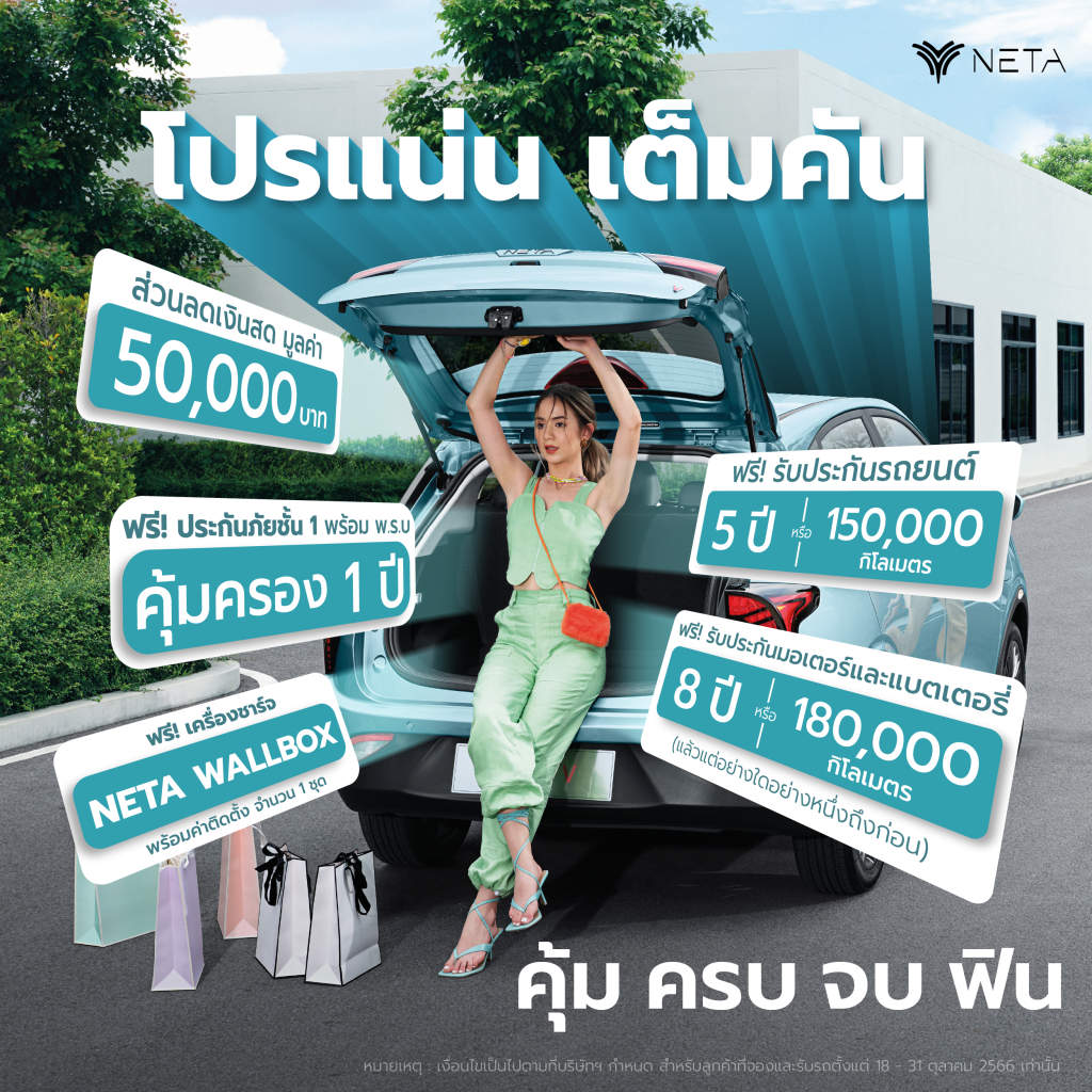มร. เป่า จ้วงเฟย ยังได้กล่าวถึงภาพรวมของตลาดรถยนต์พลังงานไฟฟ้าในช่วงไตรมาสสุดท้ายของปีนี้ว่าเป็นช่วงที่ตลาดมีการเคลื่อนไหวมากที่สุดเนื่องจากมาตรการสนับสนุนกำลังจะสิ้นสุดลง ประกอบกับงาน Motor Expo ที่กำลังจะจัดขึ้นในช่วงปลายปี ทำให้ผู้ประกอบการรถยนต์พลังงานไฟฟ้าต่างสรรหามาตรการมากระตุ้นการตัดสินใจของผู้บริโภคออกมาในหลากหลายรูปแบบ โดยในส่วนของ NETA ได้มีการมอบข้อเสนอพิเศษให้กับผู้ที่สนใจ NETA V ซึ่งปัจจุบันมีราคาจำหน่าย 549,000 บาท อาทิ การมอบส่วนลดมูลค่า 50,000 บาท ฟรีเครื่องชาร์จ NETA WALLBOX และค่าติดตั้ง พร้อมการรับประกันรถยนต์ 5 ปี หรือ 150,000 กิโลเมตร การรับประกันมอเตอร์และแบตเตอรี่ 8 ปี หรือ 180,000 กิโลเมตร รวมไปถึงฟรีค่าแรงและค่าอะไหล่รถยนต์เมื่อเช็คระยะ 1 ปี หรือ 10,000 กิโลเมตร ชุดแต่งรอบคันและอื่น ๆ อีกมากมาย