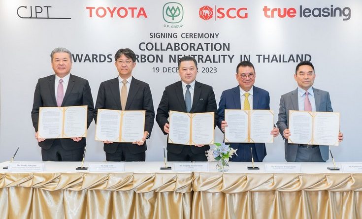 เครือเจริญโภคภัณฑ์ (ซีพี) ทรู ลีสซิ่ง ปูนซิเมนต์ไทย (เอสซีจี) โตโยต้า มอเตอร์ คอร์ปอเรชั่น (โตโยต้า) และ Commercial Japan Partnership Technologies Corporation (CJPT) ร่วมลงนามในบันทึกความเข้าใจ (MOU) เพื่อเร่งความร่วมมือในการมุ่งสู่การบรรลุความเป็นกลางทางคาร์บอนในประเทศไทย โดย MOUนี้ เกิดขึ้นจากความสำเร็จในปัจจุบัน ซึ่งเป็นผลจากความพยายามร่วมกันของทุกฝ่าย รวมถึงประสิทธิภาพด้านการขนส่งของซีพี และเอสซีจี และการใช้ยานยนต์จากพลังงานที่หลากหลายตามความต้องการในประเทศไทย