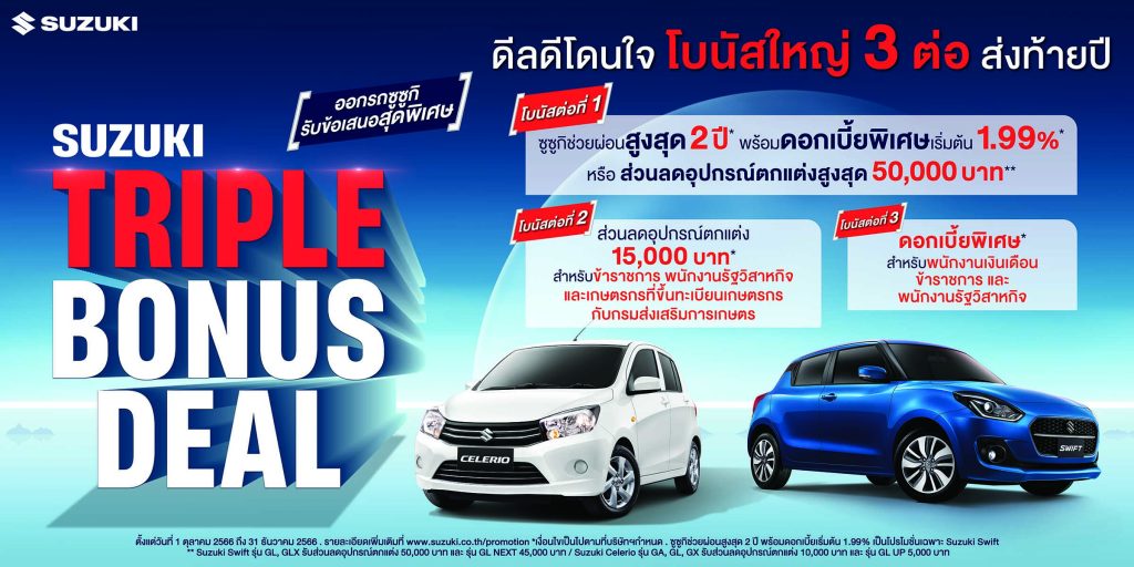 ซูซูกิ ยังเตรียมข้อเสนอสุดพิเศษสำหรับลูกค้าทุกท่านให้สามารถเป็นเจ้าของรถยนต์ซูซูกิทุกรุ่นได้ง่ายยิ่งขึ้น เพียงจองรถภายในงานมหกรรมยานยนต์นี้ รับแคมเปญพิเศษ “SUZUKI TRIPLE BONUS DEAL” ดีลโดนใจ โบนัสใหญ่ 3 ต่อ ส่งท้ายปี มอบให้ลูกค้าที่จองและรับรถยนต์ซูซูกิ ตั้งแต่วันนี้ถึง วันที่ 31 ธันวาคม 2566 ซูซูกิช่วยผ่อน เดือนละ 1,500 บาท นาน 2 ปี หรือ เลือกรับส่วนลดอุปกรณ์ตกแต่งสูงสุด 50,000 บาท (เฉพาะรุ่นที่ร่วมรายการ) หรือเลือกรับดอกเบี้ยพิเศษ 0% พิเศษ! ส่วนลดเพิ่มเติมอีก 15,000 บาท สำหรับข้าราชการ รัฐวิสาหกิจ บุคลากรทางการแพทย์ หรือ เกษตรกรผู้ขึ้นทะเบียนเกษตรกร พร้อม ฟรีประกันภัยชั้นหนึ่งในปีแรกสำหรับรถยนต์ซูซูกิทุกรุ่น