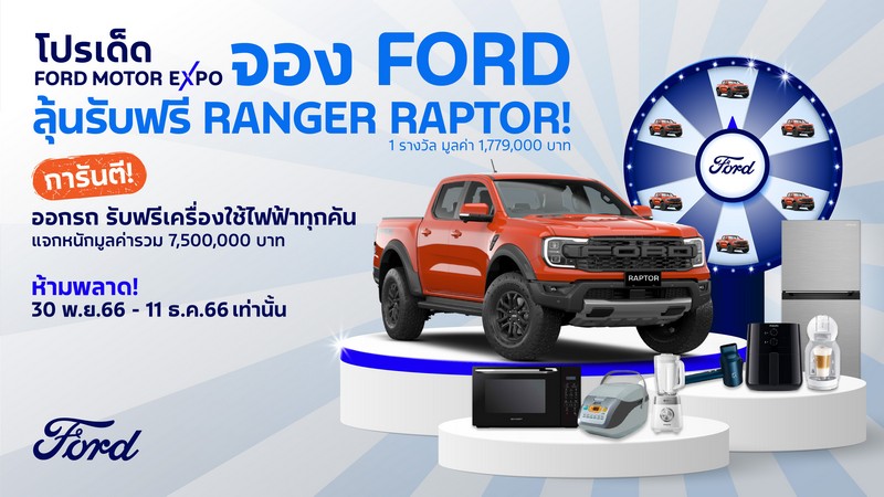 ฟอร์ด ประเทศไทย อัดโปรแรงท้ายปีต่อยอดความดุดันไปอีกขั้น เมื่อจองรถฟอร์ดรุ่นใดก็ได้ตั้งแต่วันที่ 30 พฤศจิกายน – 11 ธันวาคม 2566 และออกรถภายในวันที่ 30 ธันวาคม 2566 มีสิทธิ์ลุ้นรับรถฟอร์ด เรนเจอร์ แร็พเตอร์ รุ่น 2.0 ลิตร จำนวน 1 รางวัล มูลค่า 1,779,000 บาท โดยเมื่อจอง 1 คัน จะได้รับ 1 สิทธิ์ลุ้น พร้อมรับทันทีเครื่องใช้ไฟฟ้า 1 ชิ้น โดยการจอง 1 คัน จะได้รับเครื่องใช้ไฟฟ้า 1 ชิ้น รวมมูลค่าของรางวัลในแคมเปญถึง 7,500,000 บาท ในงานมอเตอร์ เอ็กซ์โป 2023 และที่ผู้จำหน่ายอย่างเป็นทางการของฟอร์ดทั่วประเทศ