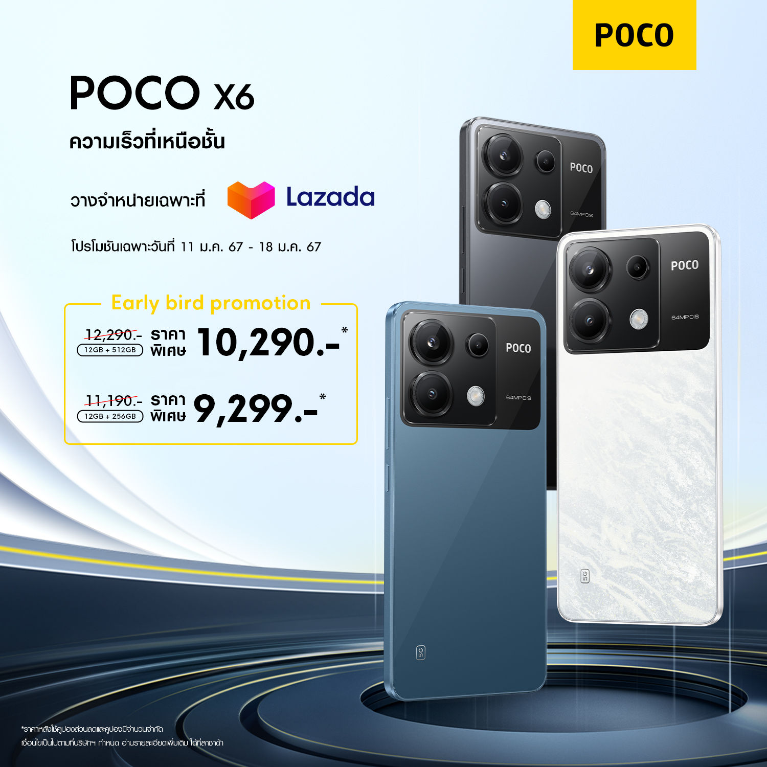POCO X6 Pro, POCO X6 และ POCO M6 Pro พร้อมให้คุณเป็นเจ้าของแล้วในราคาพิเศษ10 เฉพาะระหว่างวันที่ 11 – 18 มกราคม 2567 ที่ช่องทางออนไลน์ Lazada และ Shopee เพื่อต้อนรับการเปิดตัวอย่างเป็นทางการ โดย POCO X6 Pro รุ่นความจุ 12GB+512GB วางจำหน่ายในราคาพิเศษ 11,290 บาท10 (จากราคาปกติ 13,990 บาท) ที่ Lazada พร้อมด้วย POCO X6 รุ่นความจุ 12GB+512GB วางจำหน่ายในราคาพิเศษ 10,290 บาท10 (จากราคาปกติ 12,290 บาท) และรุ่นความจุ 12GB+256GB วางจำหน่ายในราคาพิเศษ 9,299 บาท10 (จากราคาปกติ 11,190 บาท) ที่ Lazada ในขณะที่ POCO M6 Pro รุ่นความจุ 12GB+512GB วางจำหน่ายในราคาพิเศษ 8,499 บาท10 (จากราคาปกติ 8,999 บาท) และรุ่นความจุ 8GB+256GB วางจำหน่ายในราคาพิเศษ 6,499 บาท10 (จากราคาปกติ 7,999 บาท) ที่ Shopee นอกจากนี้ พิเศษสำหรับลูกค้าที่ซื้อ POCO M6 Pro รุ่นความจุ 8GB+256GB ในช่วงวันที่ 11-18 มกราคม 2567 รับฟรี!11 สายรัดข้อมืออัจฉริยะ Smart Band 2 มูลค่า 999 บาท11 อีกด้วย