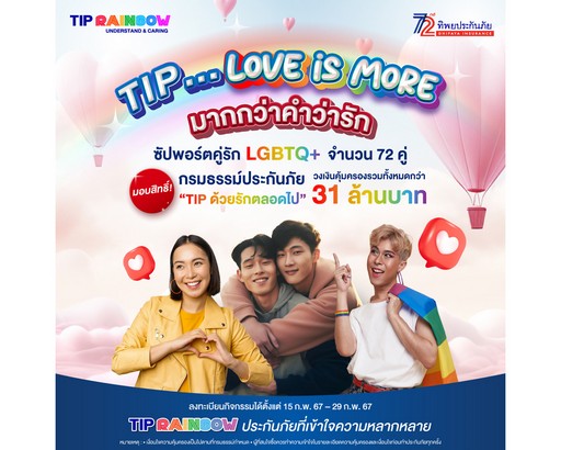 ทิพยประกันภัย ร่วมฉลองเทศกาลวาเลนไทน์และขอเป็นส่วนหนึ่งในการสนับสนุนกฎหมายสมรสเท่าเทียม ด้วยการมอบกรมธรรม์ประกันภัย “TIP ด้วยรักตลอดไป” จาก TIP Rainbow โดยทิพยประกันภัย ให้กับคู่รัก LGBTQ+ โดยกรมธรรม์ประกันภัยให้ความคุ้มครองอุบัติเหตุเและโรคร้ายแรงภาวะโคม่า จำนวน 72 คู่ทุนประกันภัยรวมกว่า 31 ล้านบาท ทั้งนี้กรมธรรม์นี้สามารถระบุผู้รับผลประโยชน์เป็น “คู่รักคู่ชีวิต” เพศเดียวกันได้ ผู้ที่สนใจสามารถ ลงทะเบียนรับสิทธิ์ กิจกรรม TIP…Love is More มากกว่าคําว่ารัก ตั้งแต่วันที่ 15 – 29 ก.พ. 67  ได้ที่หน้า Facebook Fanpage : ทิพยประกันภัย