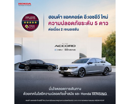 บริษัท ฮอนด้า ออโตโมบิล (ประเทศไทย) จำกัด ประกาศความสำเร็จของ ฮอนด้า แอคคอร์ด อี:เอชอีวี ใหม่ ภายใต้เจเนอเรชันที่ 11 ที่ผ่านการรับรองมาตรฐานความปลอดภัยระดับ 5 ดาว จากการทดสอบการชนของ ASEAN NCAP ซึ่งเป็นการทดสอบเพื่อวัดสมรรถนะด้านความปลอดภัยของยานยนต์รุ่นใหม่ที่วางจำหน่ายในภูมิภาคเอเชียตะวันออกเฉียงใต้ (New Car Assessment Program for Southeast Asia) นับเป็นการคว้ามาตรฐานความปลอดภัยต่อเนื่อง 2 เจเนอเรชัน โดยความสำเร็จครั้งนี้เป็นเครื่องยืนยันถึงการสร้างสรรค์และนำเสนอยนตรกรรมคุณภาพของฮอนด้า ที่มุ่งมั่นพัฒนาผลิตภัณฑ์และเทคโนโลยีด้านความปลอดภัยอันล้ำสมัย อีกทั้งตอกย้ำเจตนารมณ์และเป้าหมายของฮอนด้าในการสร้างสังคมปลอดอุบัติเหตุสำหรับทุกคนที่ใช้รถใช้ถนนร่วมกันให้เกิดขึ้น จากการใช้รถยนต์และรถจักรยานยนต์ฮอนด้าทั่วโลกภายในปี พ.ศ. 2593 (Honda Target 2050)