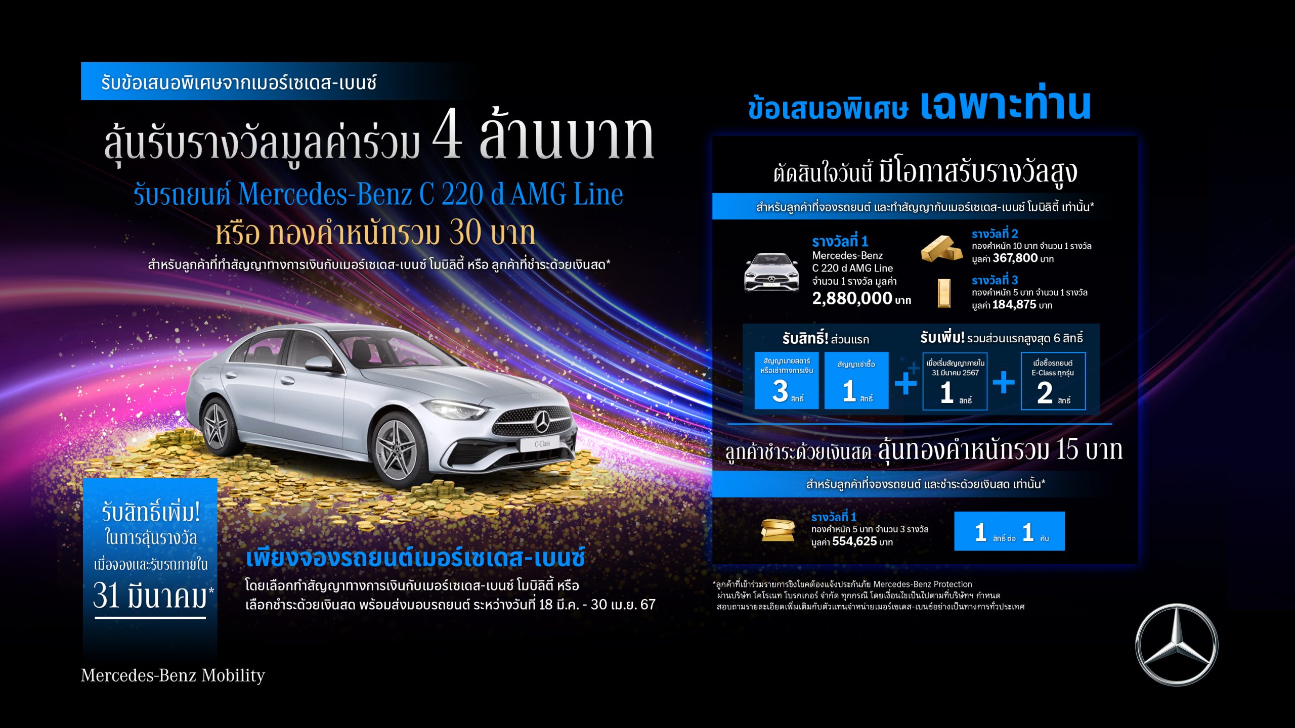 และข้อเสนอสุดยิ่งใหญ่จากเมอร์เซเดส-เบนซ์ โมบิลิตี้ ลุ้นรับรถเมอร์เซเดส-เบนซ์ C 220 d AMG Line มูลค่า 2,880,000 บาท พร้อมชิงทองคำหนักรวม 30 บาท มูลค่ารวมทั้งสิ้น 4 ล้านบาท เมื่อจองรถยนต์ใหม่เมอร์เซเดส-เบนซ์ และทำสัญญาทางการเงินกับเมอร์เซเดส-เบนซ์ โมบิลิตี้ ระหว่างวันที่ 18 มีนาคม – 30 เมษายน 2567 พร้อมเริ่มต้นสัญญาทางการเงินภายในวันที่ 30 มิถุนายน 2567