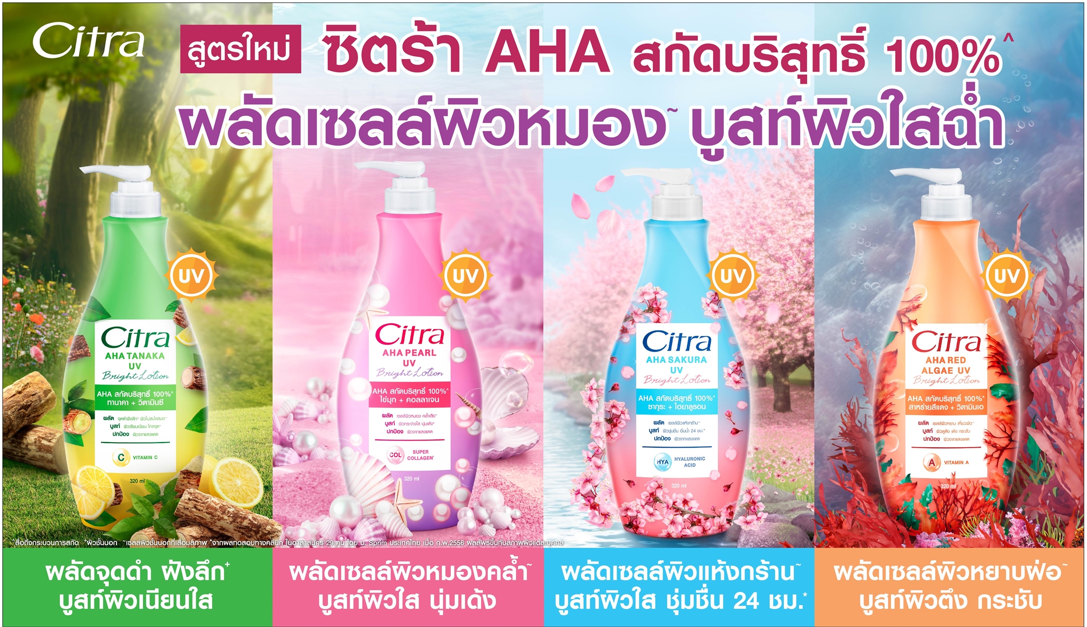 - ใหม่ล่าสุด! ซิตร้า AHA สาหร่ายแดง ยูวี ไบรท์ โลชั่น ผสานสารสกัดธรรมชาติจากสาหร่ายแดงซึ่งให้ประสิทธิภาพในการบำรุงเหนือกว่าวิตามินซี ถึง 6,000 เท่า และวิตามินเอ ช่วยผลัดเซลล์ผิวหยาบ เหี่ยวฝ่อ บูสผิวตึง เด้ง กระชับ อ่อนเยาว์