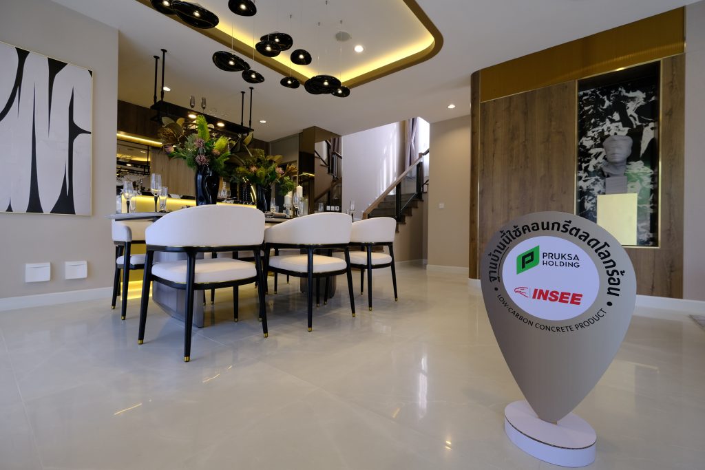 “บ้านภายใต้แบรนด์พฤกษาเป็นบ้านคาร์บอนต่ำ นอกจากการก่อสร้างโครงการโดยเลือกใช้ปูนรักษ์โลกจากปูนซีเมนต์อินทรีเพชร Easy Flow พฤกษายังเป็น ผู้พัฒนาอสังหาริมทรัพย์รายแรกที่ใช้คาร์บอนเคียว ซึ่งเป็นเทคโนโลยีสีเขียวในการผลิตแผ่นพรีคาสท์คาร์บอนต่ำในการสร้างบ้าน โดยนำคาร์บอนไดออกไซด์ที่เป็นตัวการสำคัญในการทำลายชั้นบรรยากาศมาฉีดกักเก็บเข้าไปในขั้นตอนการผสมคอนกรีต จึงช่วยลดการปล่อยคาร์บอนและก๊าซเรือนกระจกอื่น ๆ ขณะเดียวกันยังสามารถลดปริมาณการใช้ซีเมนต์ลงร้อยละ 5 แต่ยังคงประสิทธิภาพความแข็งแกร่งได้ตามมาตรฐาน และเมื่อเร็ว ๆ นี้ องค์การบริหารจัดการก๊าซเรือนกระจก ได้ประกาศรับรองคาร์บอนฟุตพริ้นท์ให้กับ อินโน พรีคาสท์ โดยได้รับฉลากลดคาร์บอนฟุตพริ้นท์ Carbon Footprint Reduction (CFR) หรือฉลากลดโลกร้อน ซึ่งถือเป็นพรีคาสท์รายแรก รายเดียว ของอุตสาหกรรมในประเทศไทยที่ได้การรับรอง อีกทั้งยังมีวัสดุก่อสร้างอื่น ๆ ด้วยเช่นกันที่ได้รับฉลากคาร์บอนฟุตพริ้นท์ของผลิตภัณฑ์ Carbon Footprint of Product (CFP)