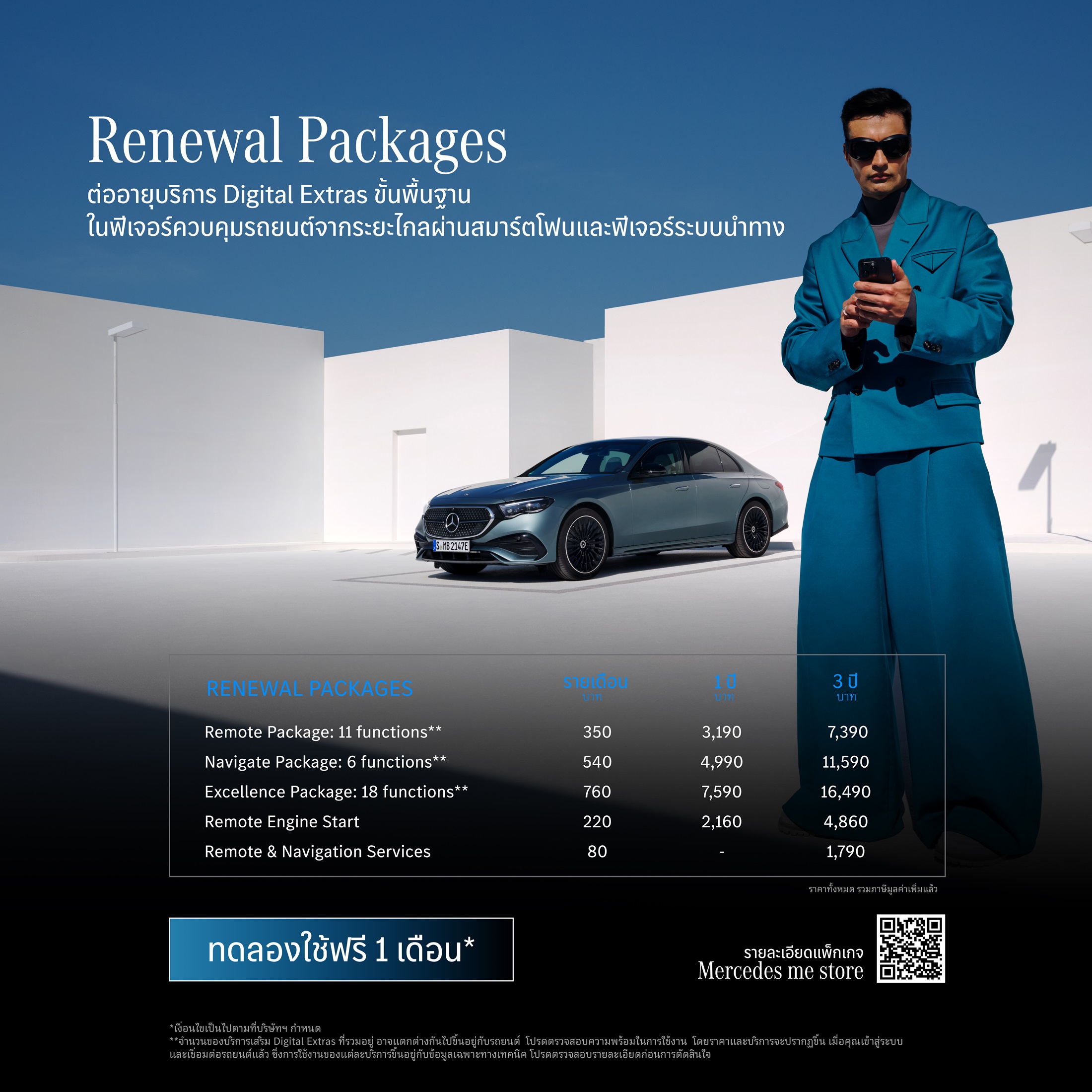 - Renewal Packages : การต่ออายุบริการ Digital Extras ขั้นพื้นฐาน สำหรับลูกค้ารถยนต์เมอร์เซเดส-เบนซ์ ตั้งแต่ปี 2019 เป็นต้นไป ที่รองรับแอปพลิเคชัน Mercedes me และหมดอายุการใช้งาน Digital Extras ฟรี 3 ปีแรก* ในราคาแบบรายเดือน เริ่มต้นเพียง 80 บาท/เดือน* ดังนี้