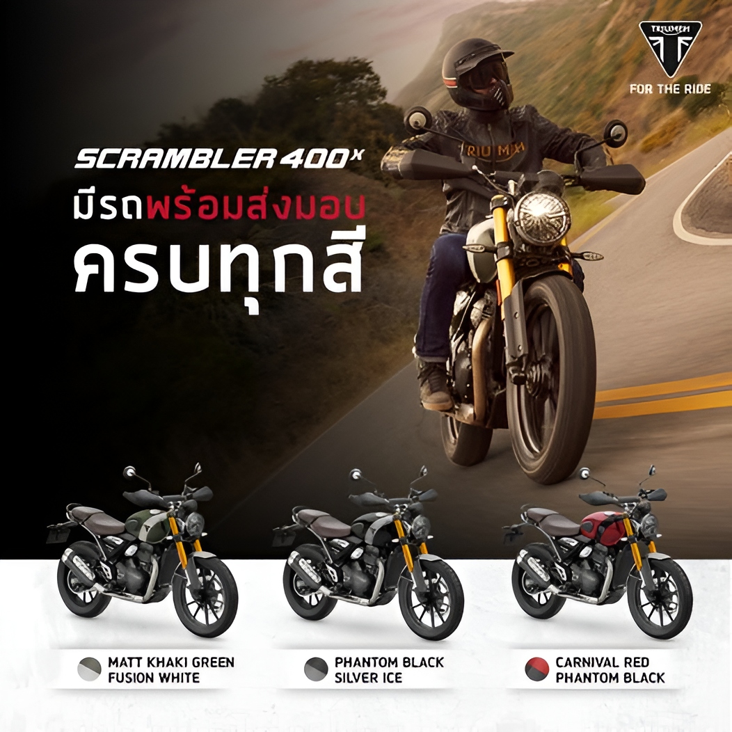 ส่วน Scrambler 400 X ราคา 184,900 บาท มี 3 สีให้เลือก ได้แก่ สี Matt Khaki Green/Fusion White สี Phantom Black/Silver Ice และสี Carnival Red/Phantom Black