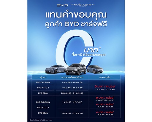 บริษัท เรเว่ ออโตโมทีฟ จำกัด ผู้จัดจําหน่ายและให้บริการหลังการขายรถยนต์พลังงานไฟฟ้า BYD อย่างเป็นทางการในประเทศไทย บริษัทฯ ขอมอบสิทธิพิเศษแทนคำขอบคุณให้กับลูกค้า BYD ที่ให้การสนับสนุนและความไว้วางใจเป็นอย่างดีเสมอมา ลูกค้า BYD สามารถนำรถมาชาร์จไฟฟ้าได้ฟรี! เริ่มต้น 0 บาท ที่สถานีชาร์จ RÊVERSHARGER ทั่วประเทศ สำหรับรถคันแรกที่ทางบริษัทฯ ได้จำหน่ายทุกรุ่น ทุกคัน ไม่่ว่าจะเป็น BYD DOLPHIN, BYD ATTO 3 และ BYD SEAL ตั้งแต่วันที่ 1 สิงหาคม 2567 เป็นต้นไป นานสูงสุดถึงวันที่ 3 มกราคม 2568