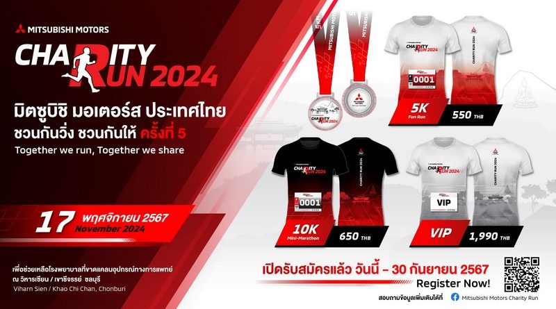 บริษัท มิตซูบิชิ มอเตอร์ส (ประเทศไทย) จำกัด และ มูลนิธิ มิตซูบิชิ มอเตอร์ส ประเทศไทย ขอเชิญทุกท่านเข้าร่วมงานวิ่งการกุศล “มิตซูบิชิ มอเตอร์ส ชวนกันวิ่ง ชวนกันให้ ครั้งที่ 5” (Mitsubishi Motors Charity Run 2024 #5 ‘Together We Run, Together We Share’) ในวันอาทิตย์ที่ 17 พฤศจิกายน 2567 พร้อมเปิดรับสมัครตั้งแต่วันนี้ – 30 กันยายน 2567 โดยรายได้ส่วนหนึ่งจะนำไปสมทบทุนจัดซื้อเครื่องมือทางการแพทย์เพื่อสนับสนุนการดำเนินงานของโรงพยาบาลที่ขาดแคลน สอดคล้องกับความมุ่งมั่นในการดำเนินโครงการเพื่อสังคมภายใต้วิสัยทัศน์ “สรรค์สร้าง เคียงข้าง สังคมไทย” ใน 3 ด้านหลัก ได้แก่ สิ่งแวดล้อม การศึกษา และสุขภาพ
